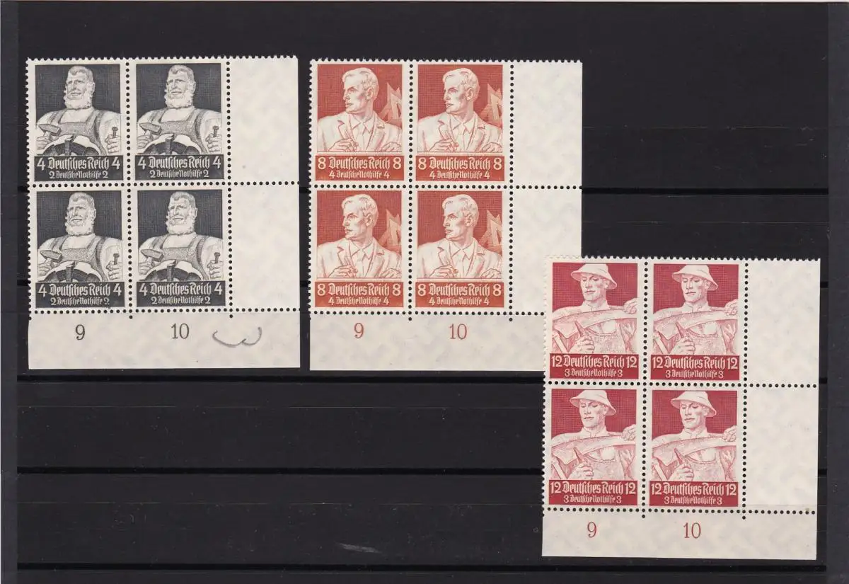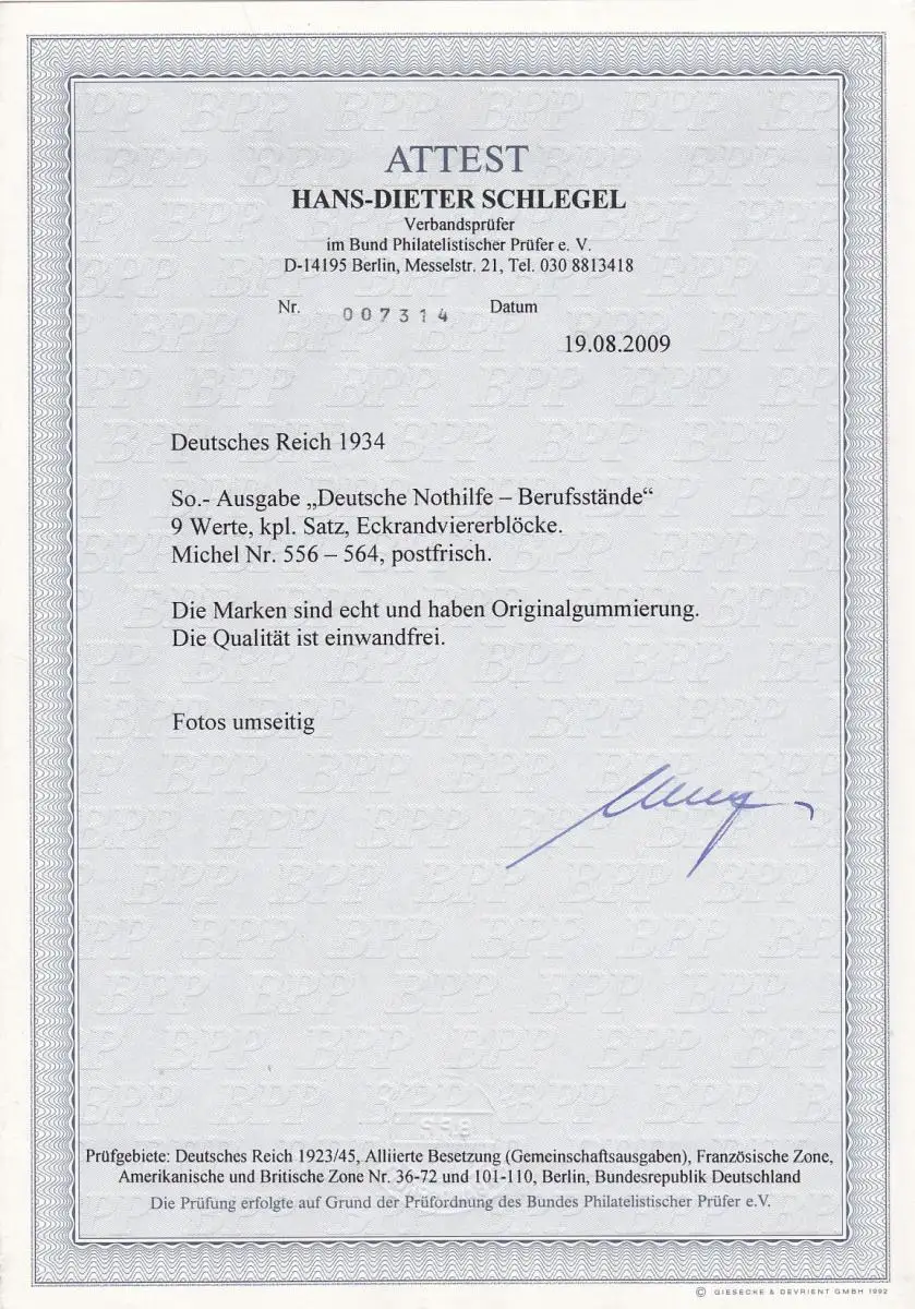 Deutsches Reich: MiNr. 556-564: Berufsstände: ECKRAND Viererblock, BPP Attest