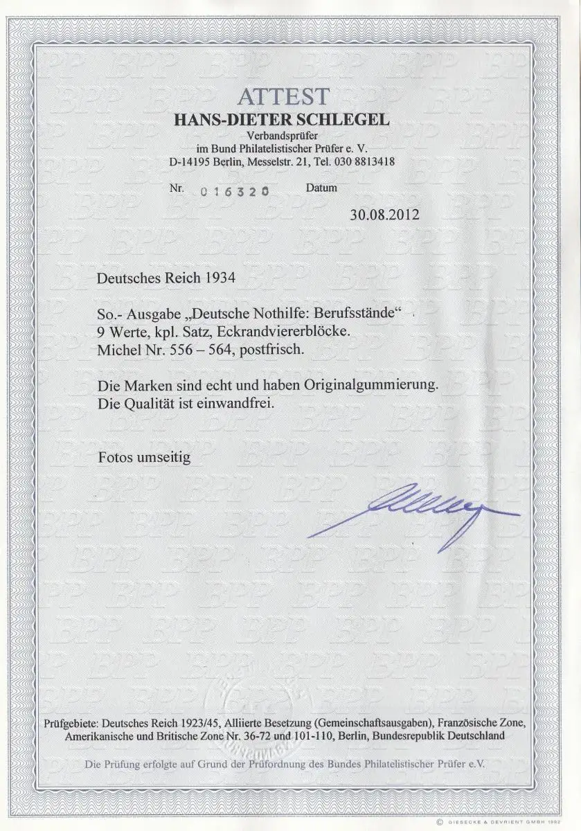 Deutsches Reich: MiNr. 556-564, postfrisch im Viererblock - Eckrand, BPP Attest