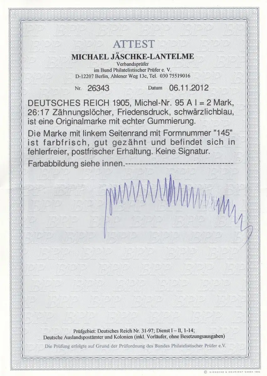 Deutsches Reich: MiNr. 95 AI, Platte Nr. 145, postfrisch mit BPP Attest