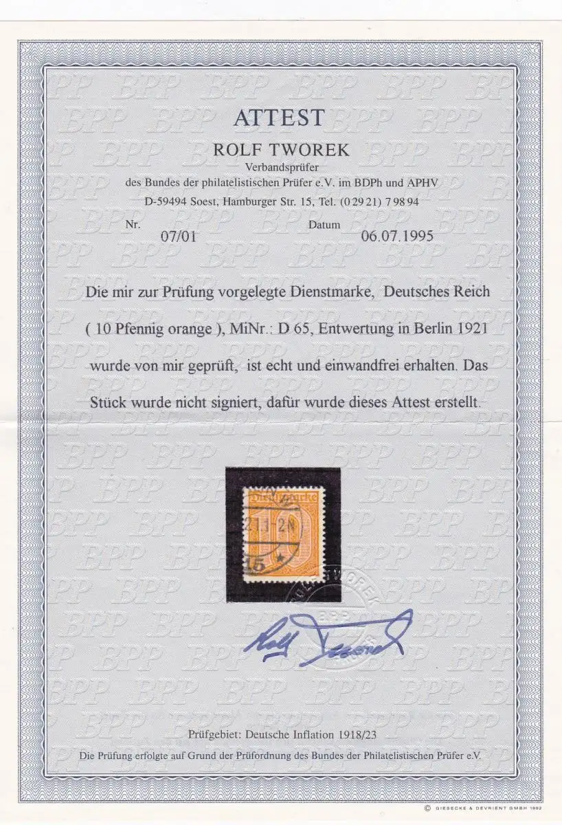 Deutsches Reich: MiNr. D65, gestempelt, BPP Attest