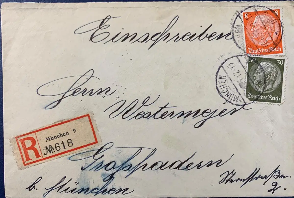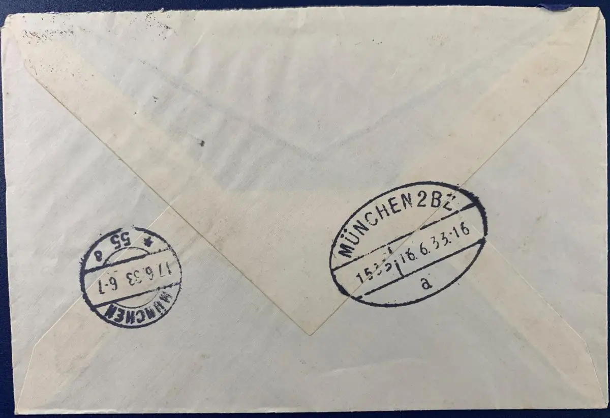 Frankiert mit Mi.Nr. 517 und 523, gelaufen als Einschreiben mit Poststempel vom 16.06.1933 in München.