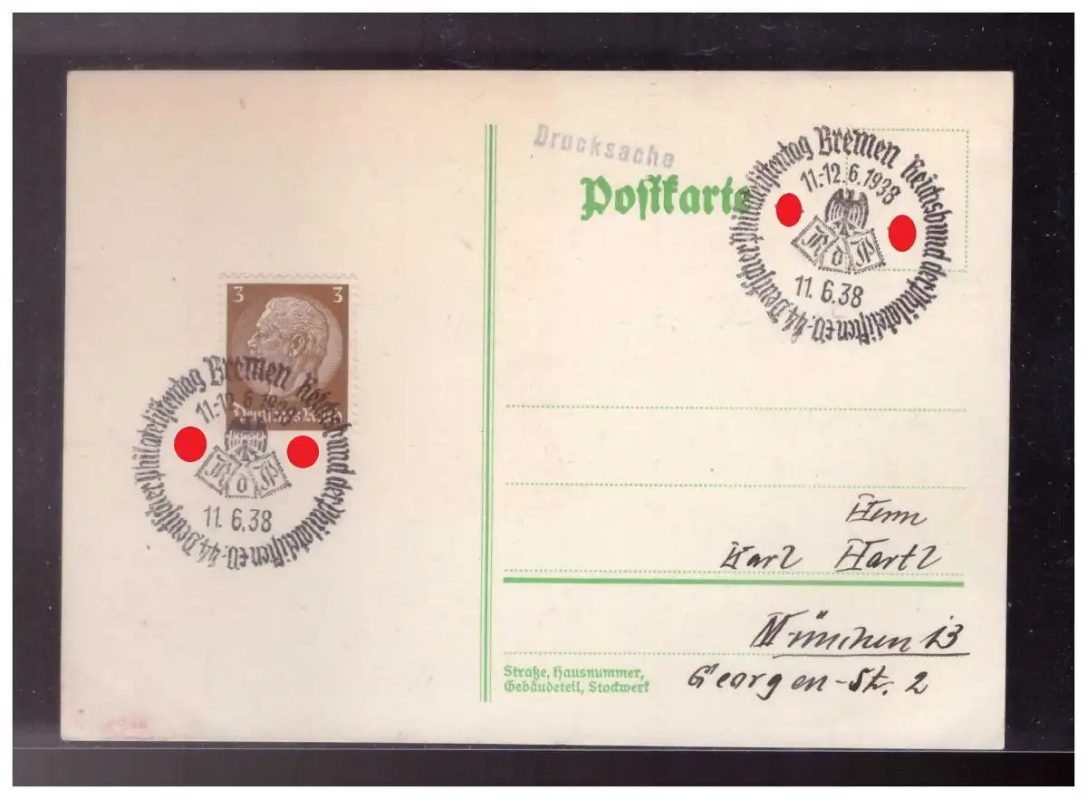 Dt- Reich (024344) Postkarte mit Sonderstempel Deutscher Philtelistentag Bremen vom 11.6.1938