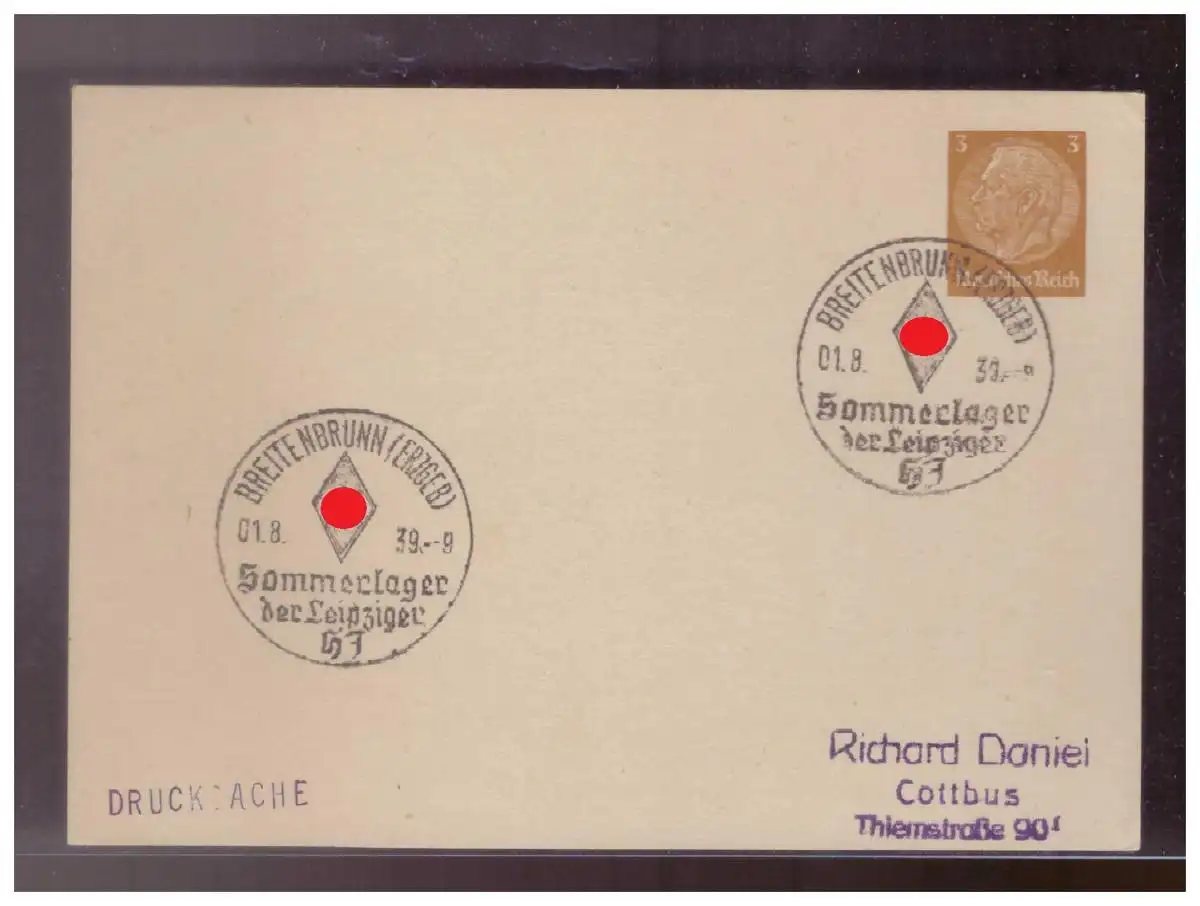 Dt- Reich (024350) Privatganzsache PP122/ A1 mit SST, HJ (Hitlerjugend) Breitenbrunn Sommerlager der Leipziger 1.8.1939