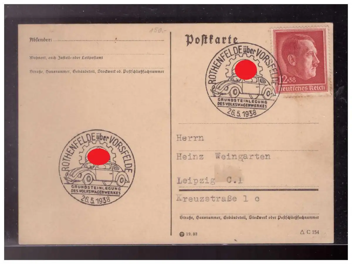 Dt- Reich (024359) Postkarte mit SST Rothenfelde über Vorsfelde, Grundsteinlegung des Volkswagenwerkes, 26.5.1938