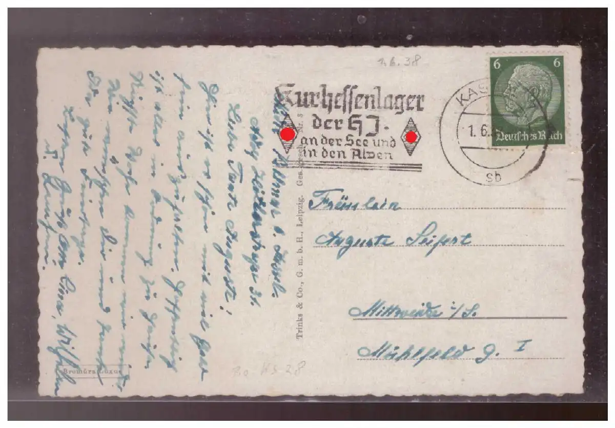 Dt- Reich (024427) Ak Kassel, Werbestempel Kurhessenlager der HJ an der See und den Alpen, gelaufen Kassel 1.6.1938