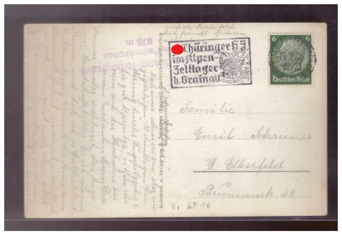 Dt- Reich (024439) Ak Patenkirchen, gelaufen 1938 mit Werbestempel Thüringer HJ im Alpen Zeltlager bei Grainau