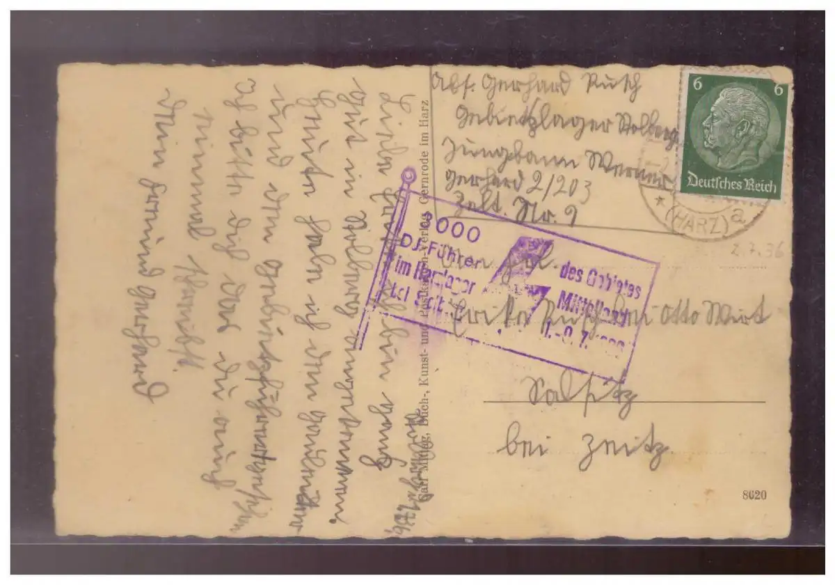 Dt- Reich (024441) Ak Stollberg mit Fahnenstempel 3000 DJ Führer im Harzlager bei Stollberg des Gebietes Mittelland,gel