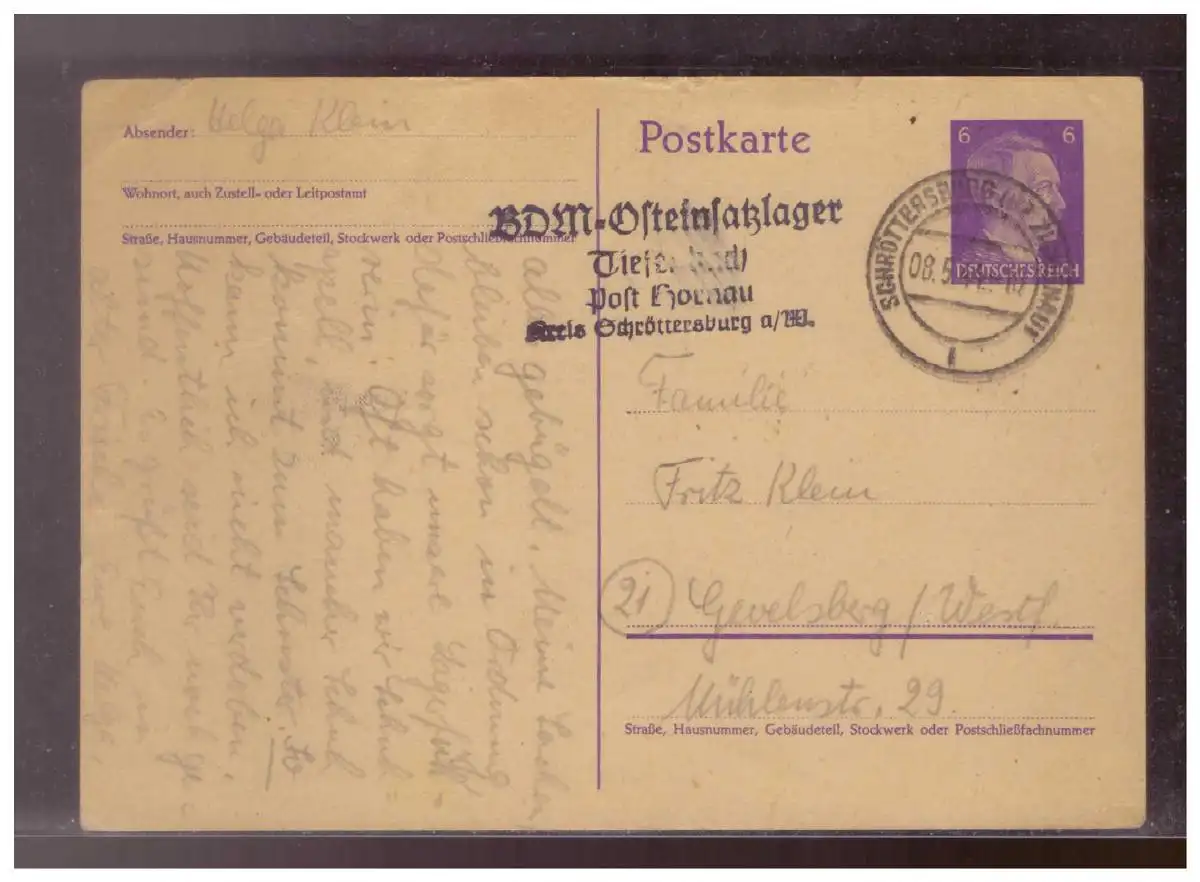 Dt- Reich (024468) Ganzsache gelaufen 8.5.1944 Schröttersberg mit BDM Osteinsatzlager Stempel