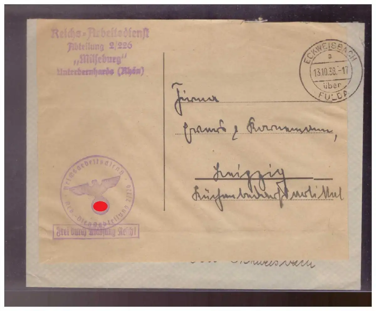 Dt- Reich (024469) Doppel verwendeter Umschlag gelaufen Portofrei Eckweisbach, Reichs- Arbeitsdienst 2/226 Milseburg