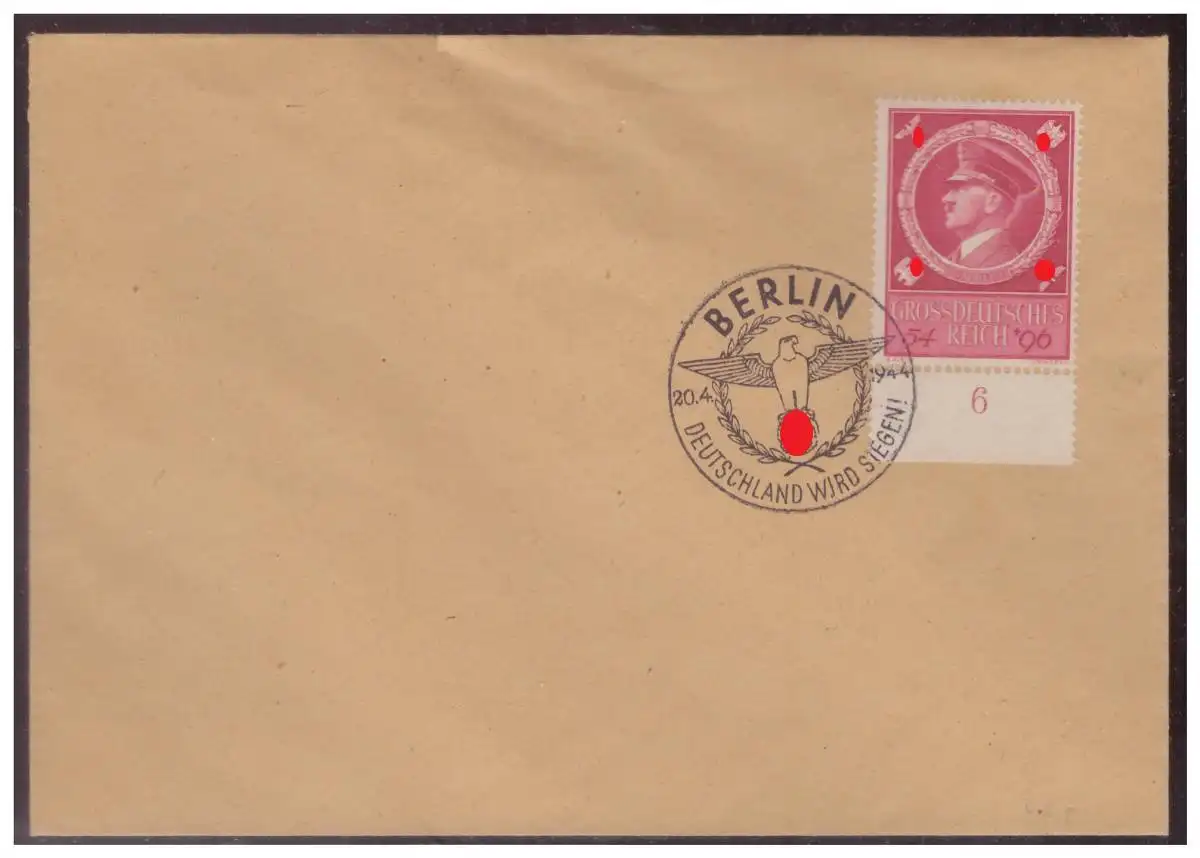 Dt- Reich (007761) Beleg mit Unterrand MNR 887 blanco gestempelt mit SST Berlin, Deutschland wird siegen am 20.4.1944