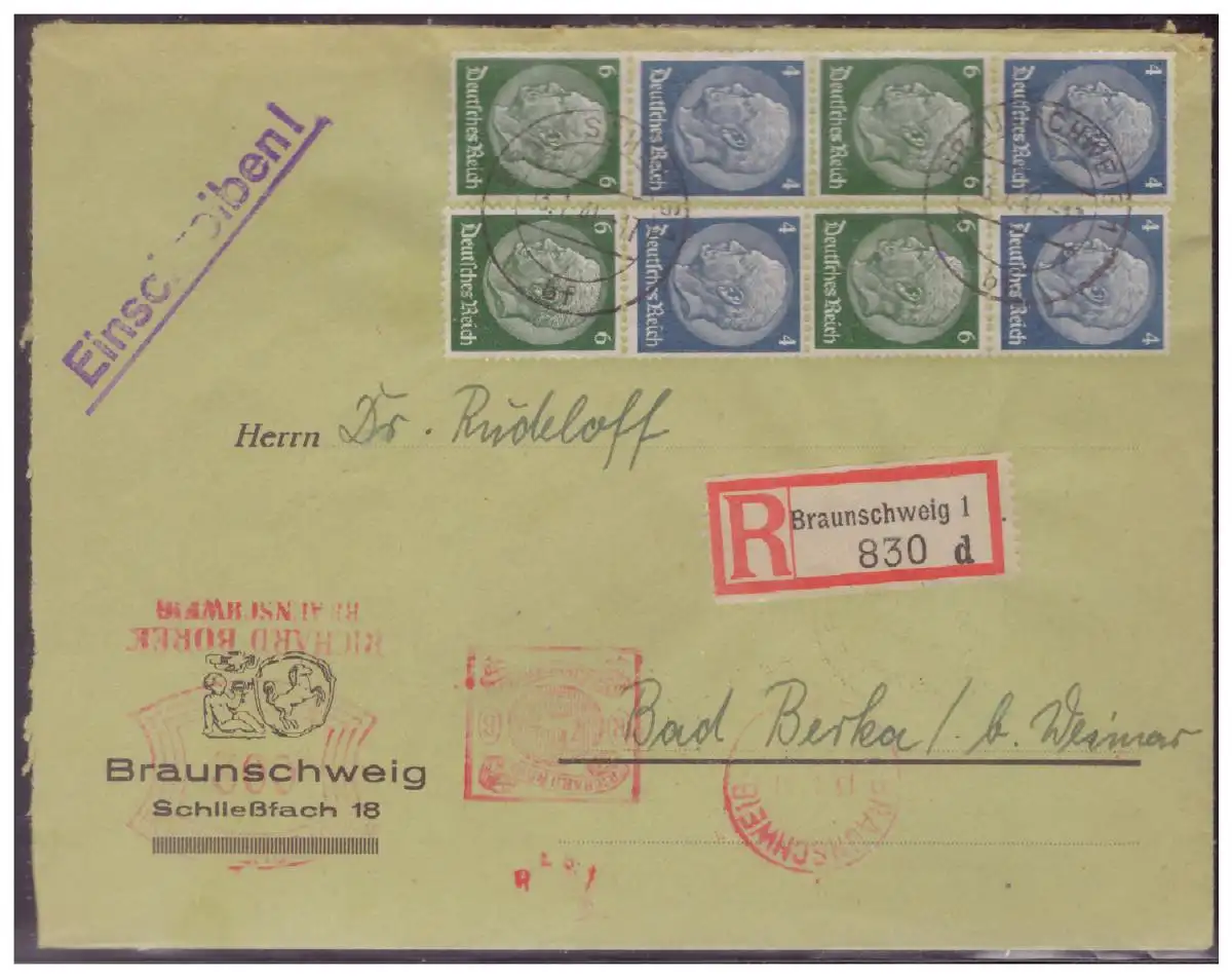 Dt- Reich (007788) Einschreiben Teilbarfrakatur mit Rollenmarken mit Freistempler Richard Borek Braunschweig vom 13.1.41