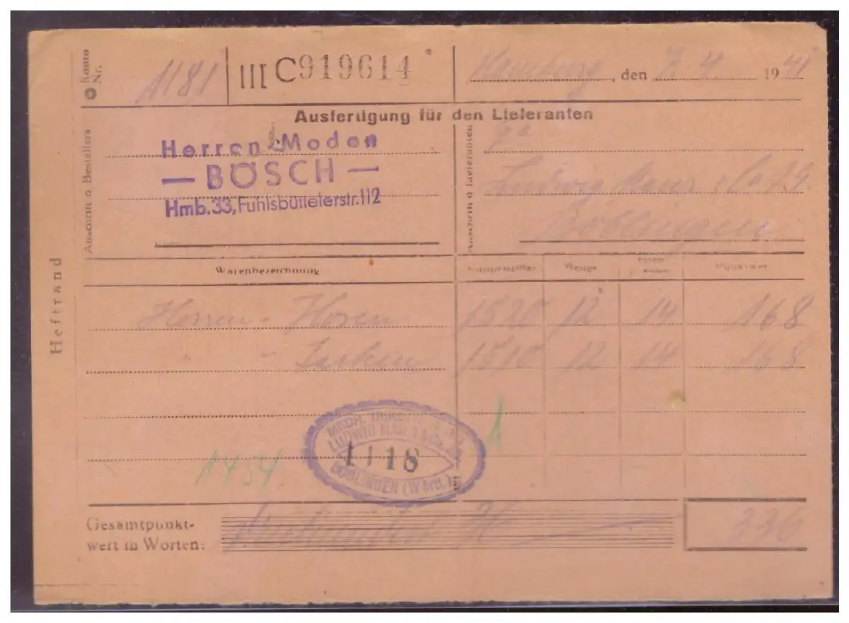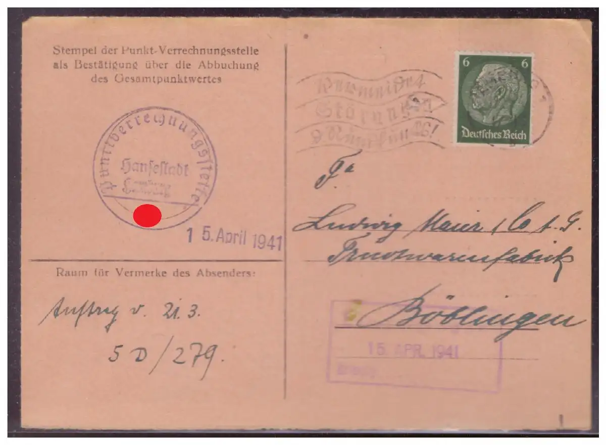 Dt- Reich (008104) Postkarte Punktverrechnungsstelle Hansestadt Hamburg gelaufen nach Böblingen vom 1941