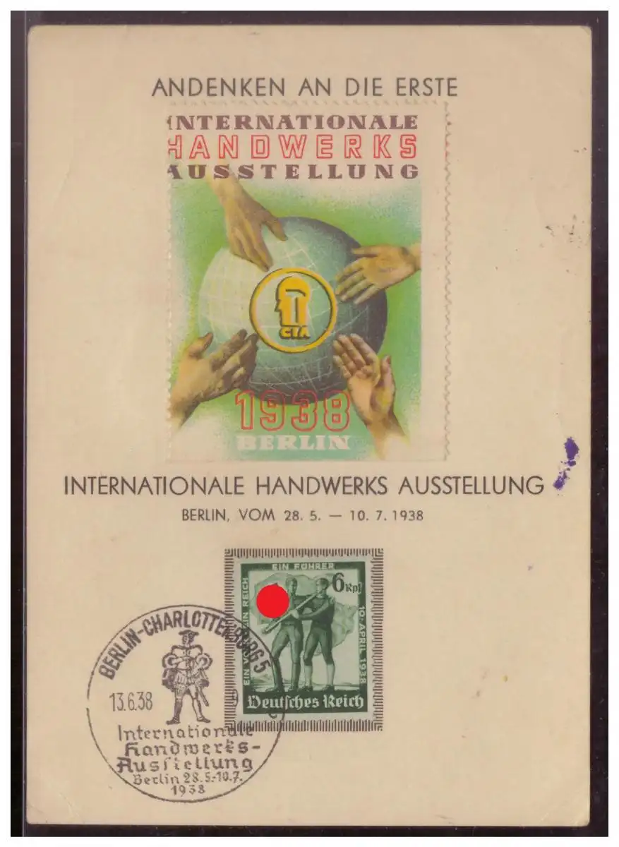 Dt- Reich (008484) Postkarte Andenken an die erste Internationale Handwerks Ausstellung 1938 Berlin, gel. mit Nachporto