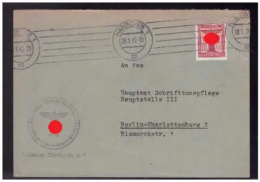 Dt- Reich (008603) Dienstbrief NSDAP Gau Hannover- Braunschweig, gelaufen Hannover am 28.1.1942