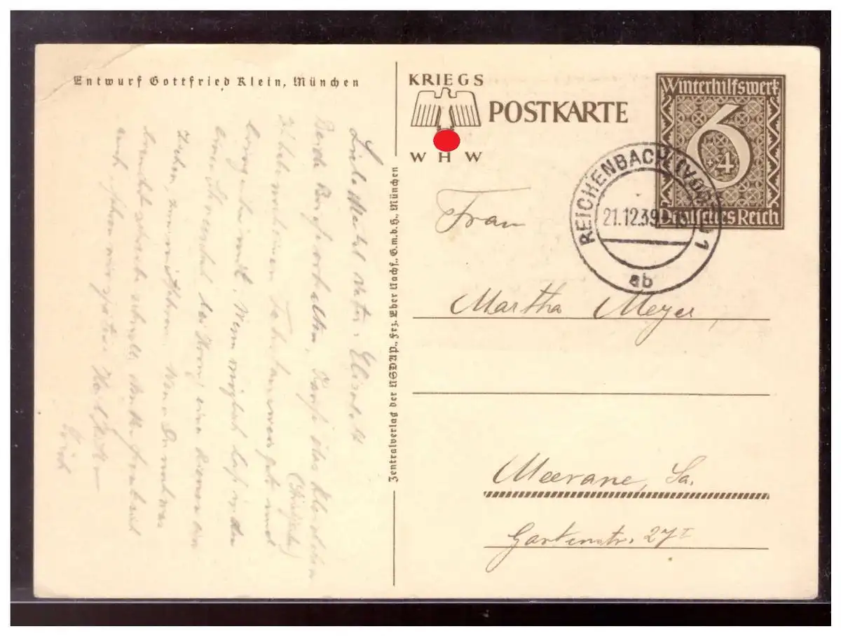 Dt.- Reich (020002) Ganzsache P287, Danzig ist Deutsch gelaufen Reichenbach/ Vogtl. am 21.12.1939