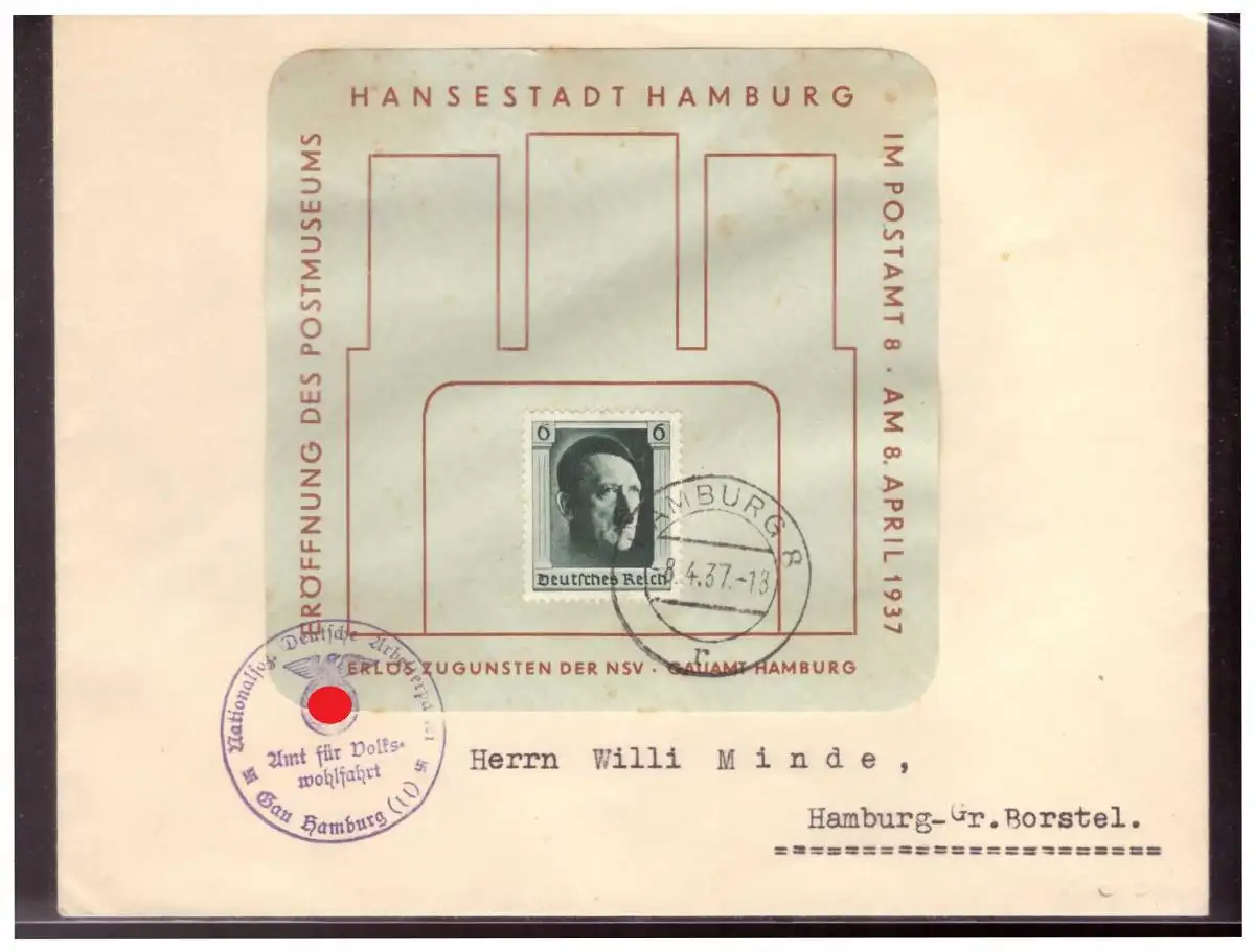 Dt.- Reich (020080) Gedenkblatt auf Umschlag Hansestadt Hamburg mit Dienststempel Amt für Volkswohlfahrt, Gau Hamburg