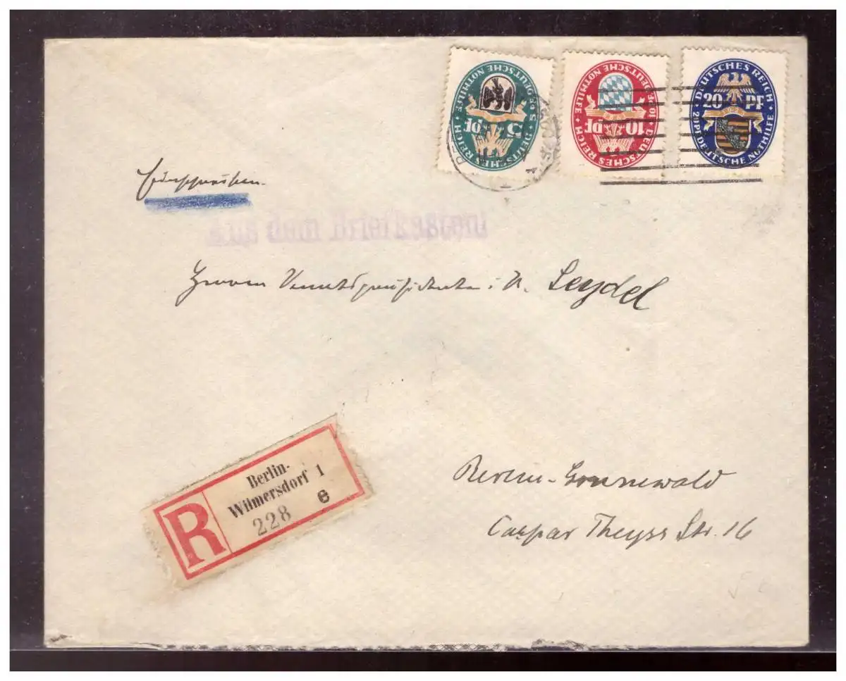 Dt.- Reich (020084) Einschreiben Aus dem Briefkasten Satzbrief MNR 375/ 377 Deutsche Nothilfe Wappen, gelaufen Berlin