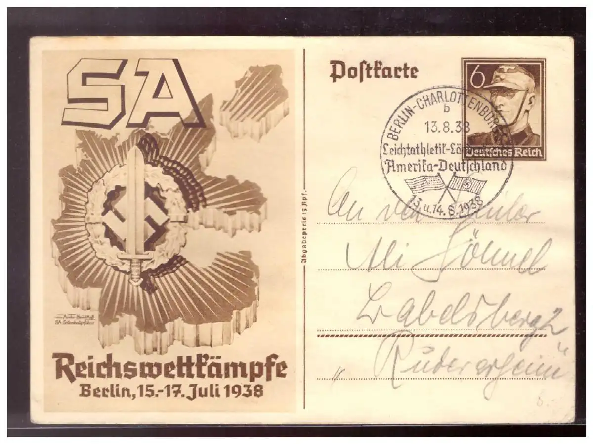 Dt.- Reich (020188) Propaganda Ganzsache P 271 Reichswettkämpfe der SA in Berlin, gelafen mit SST Berlin 13.8.1938