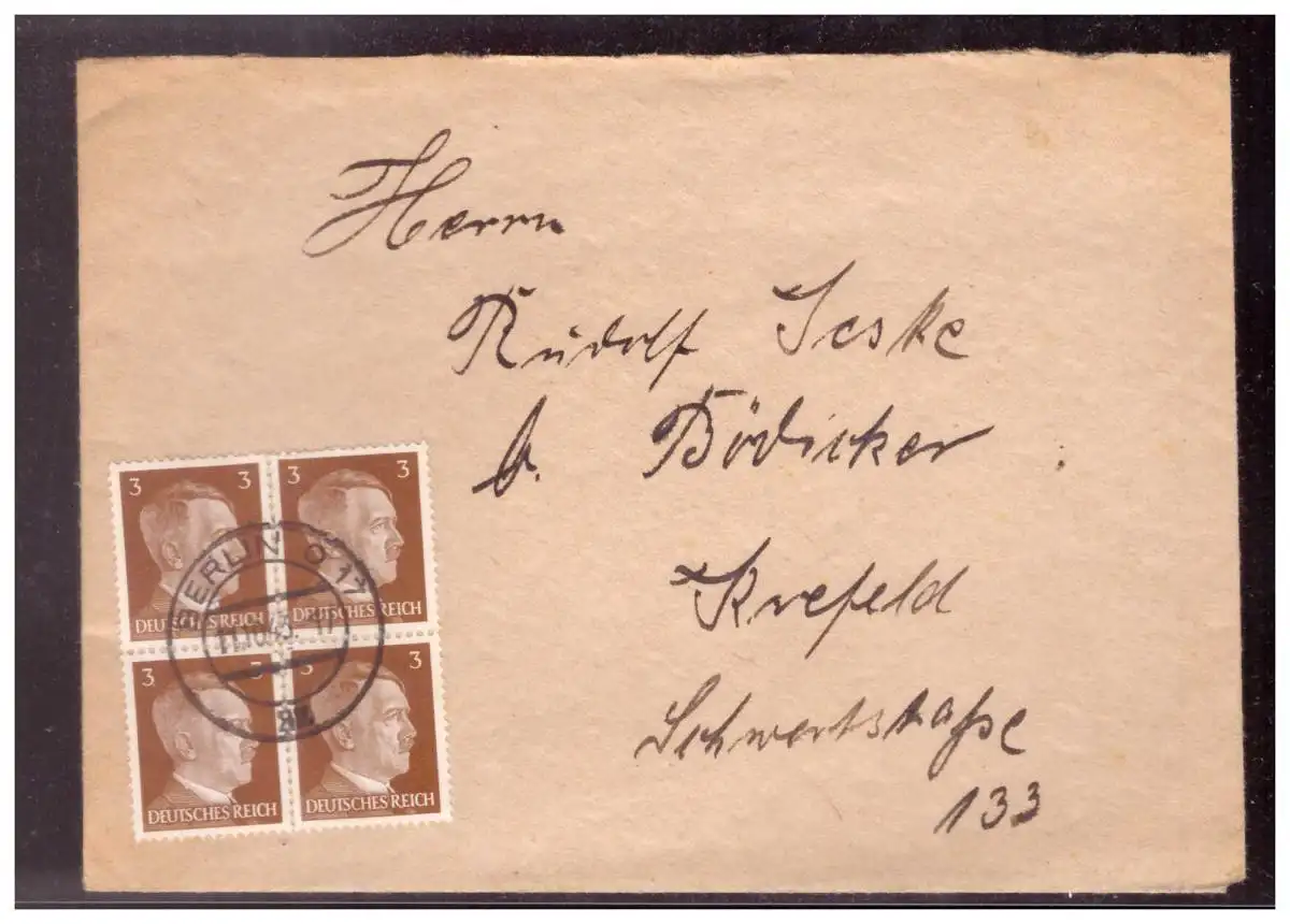 Dt- Reich (020225) Brief mit Adolf Hitlermarke Frankatur MNR 782 Viererblock gelaufen Berlin am 11.10.1943