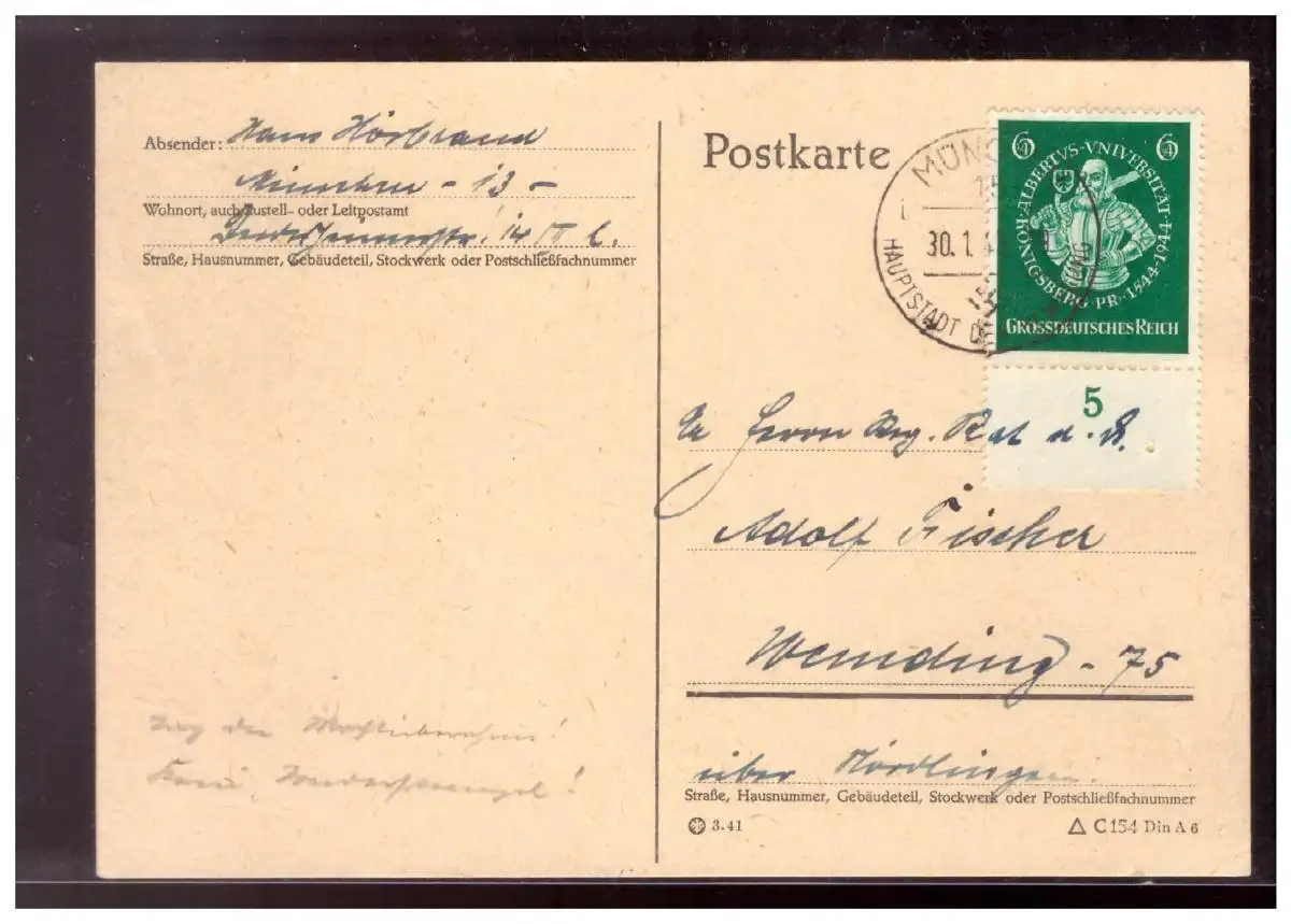 DT-Reich (020950) Postkarte mit MNR 896 Unterrand gelaufen mit TST München am 30.1.1945
