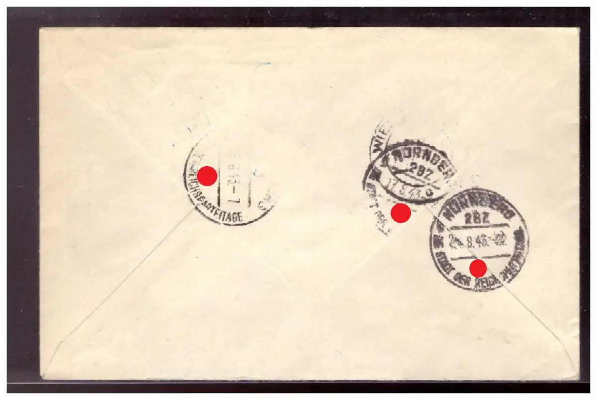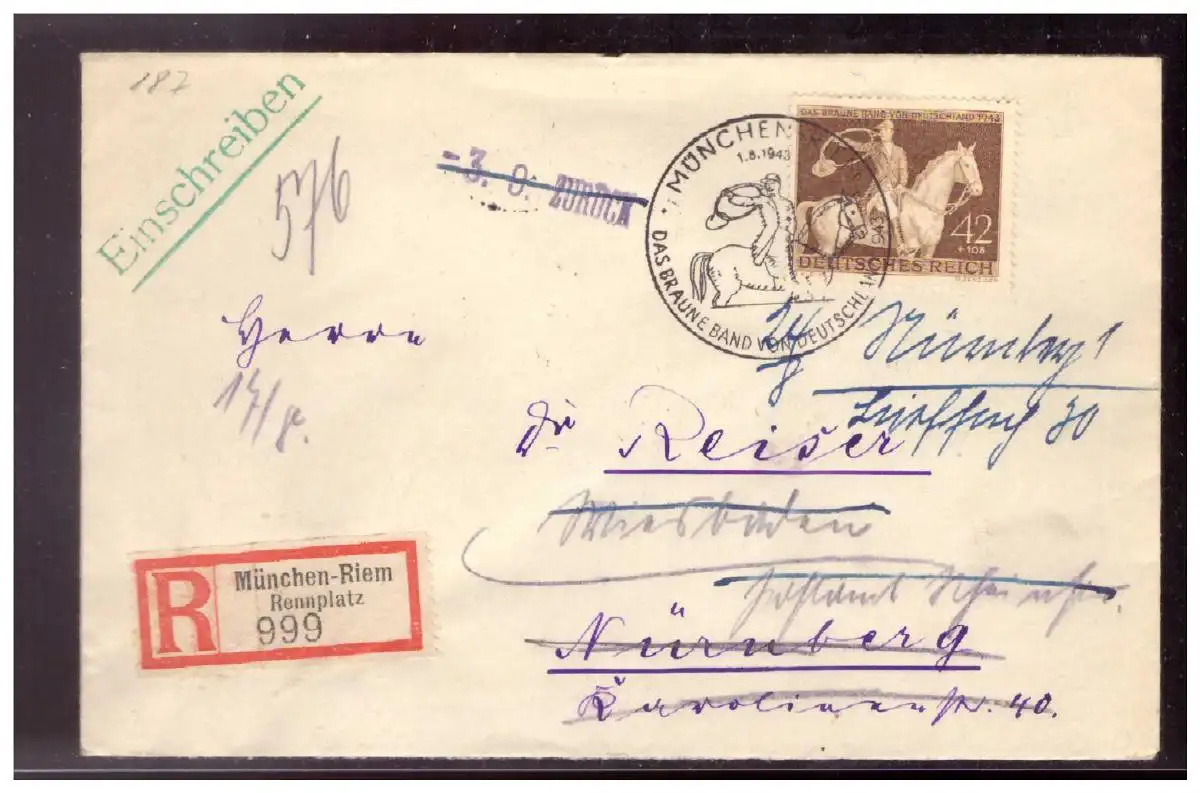 DT-Reich (020957) Einschreiben nach Nürnberg mit Weiterleitung gelaufen von München- Riem Rennplatz mit SST am 1.8.1943