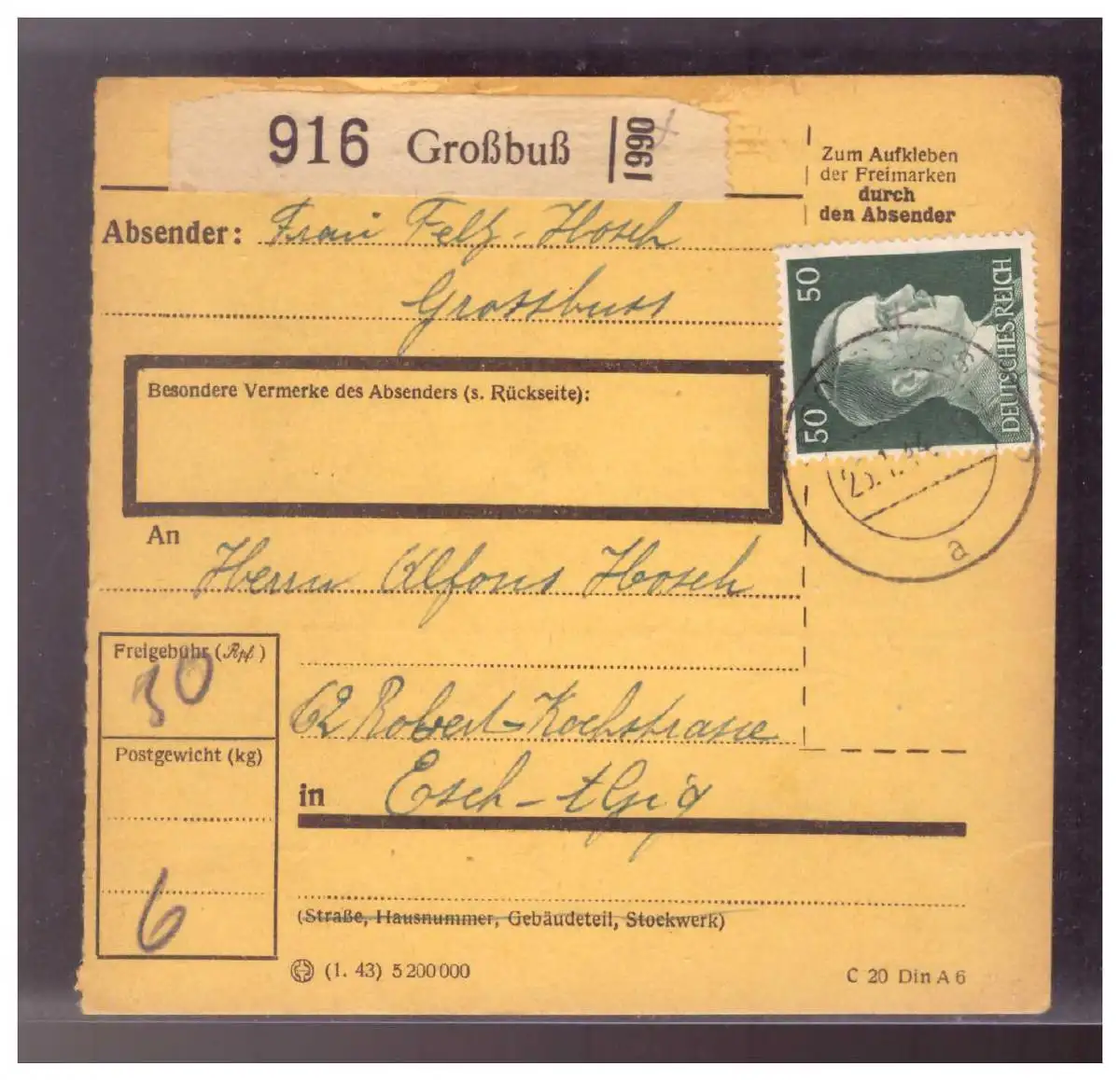 Dt- Reich (020971) Paketkarte Hitlerfrankatur Großbuß vom 26.1.1944
