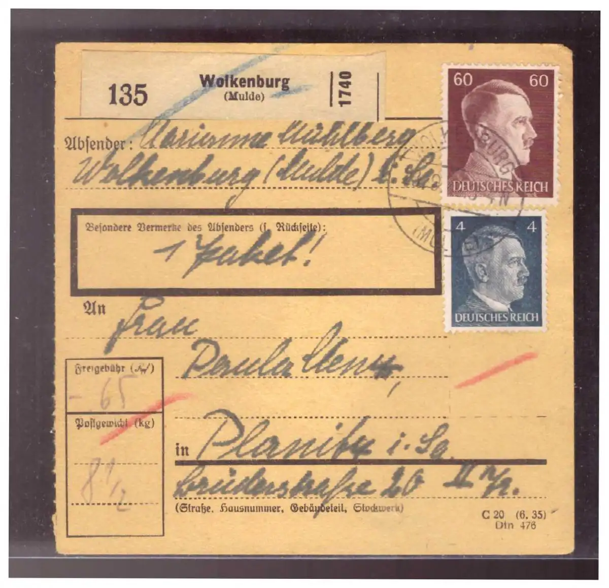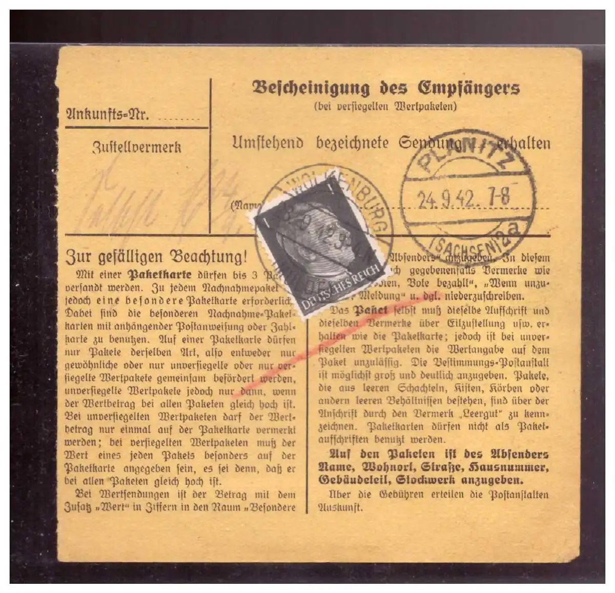 Dt- Reich (020976) Paketkarte Hitlerfrankatur Wolkenburg/ Mulde 28.9.1942