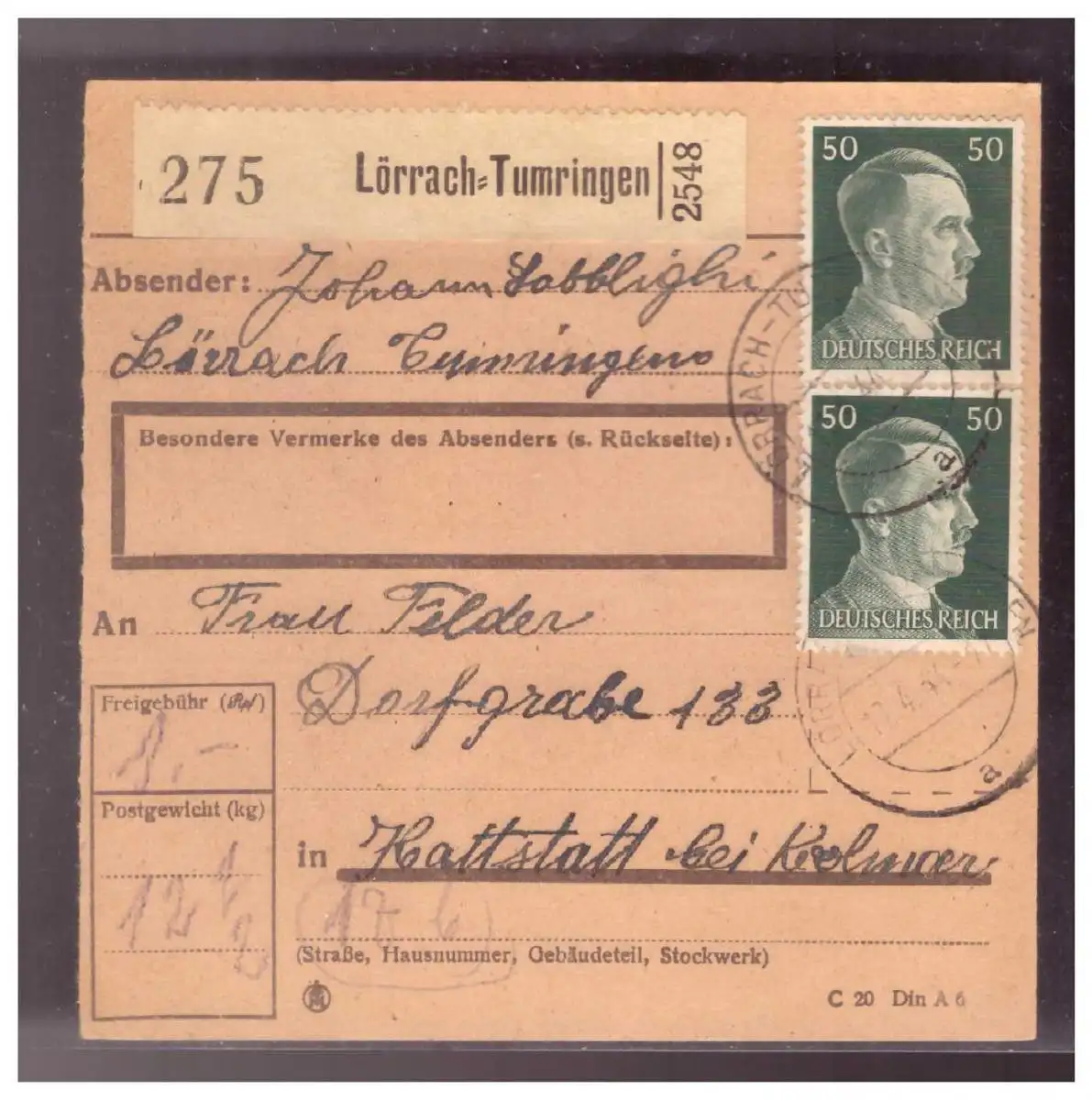 Dt- Reich (020979) Paketkarte Hitlerfrankatur Lörrach- Tumringen vom 17.4.1944