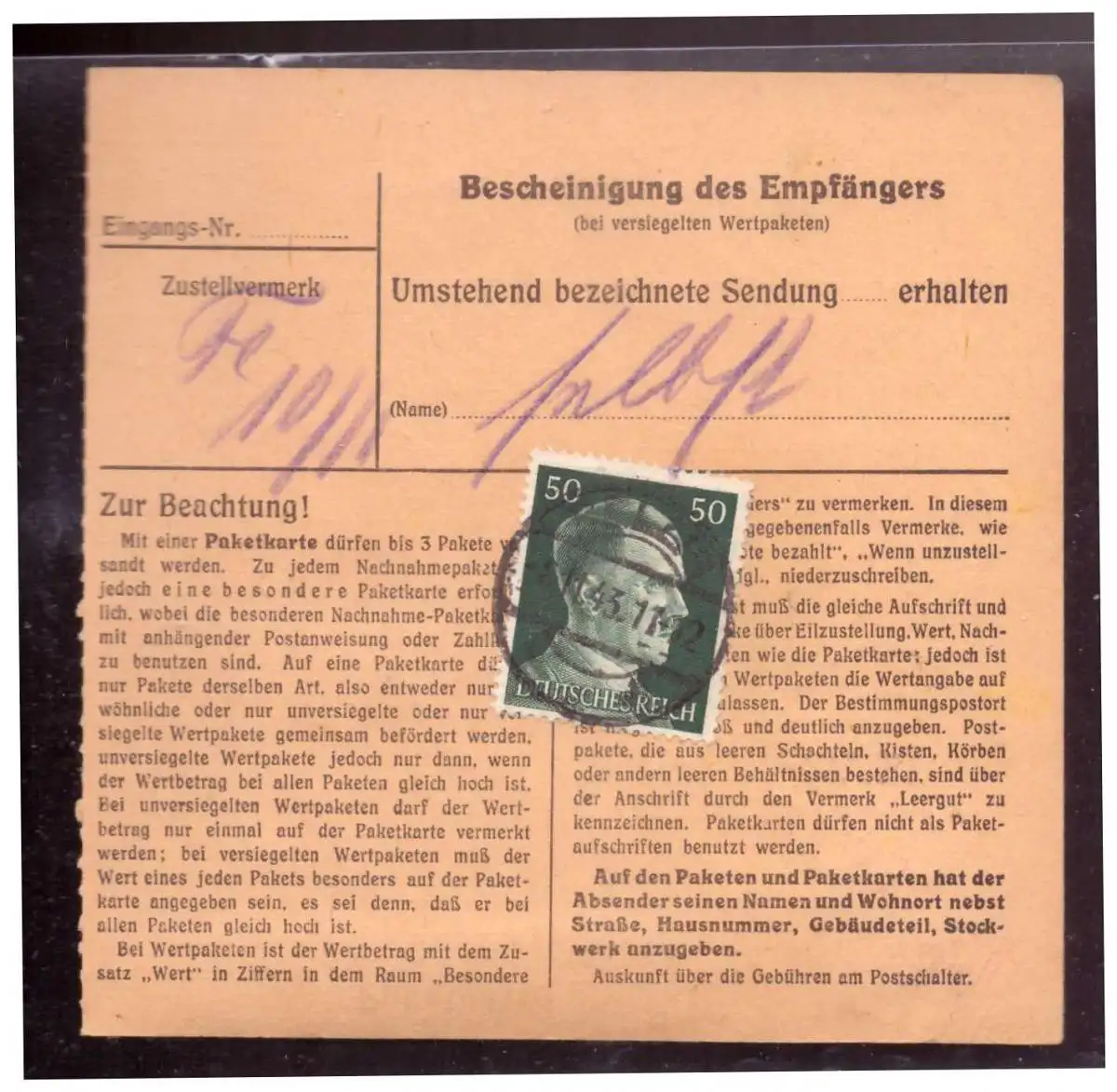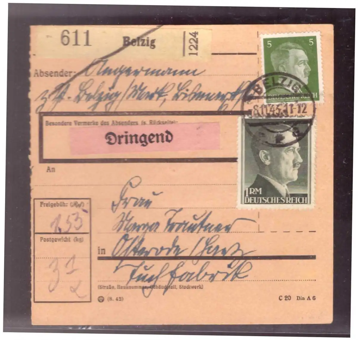 Dt- Reich (020985) Paketkarte Hitlerfrankatur Beizig vom 8.11.1943