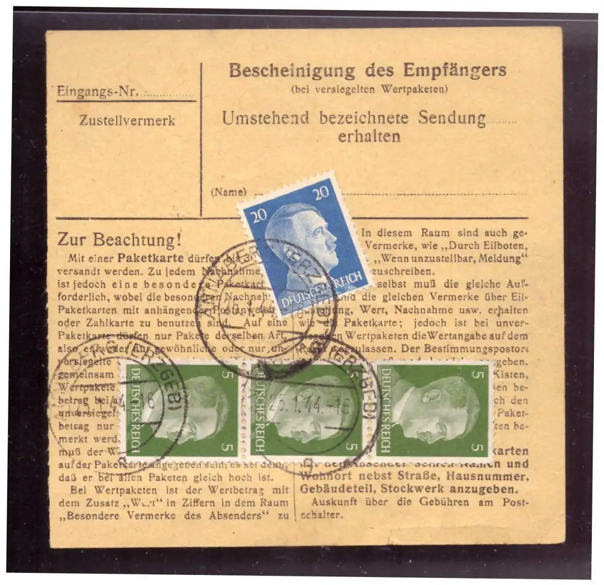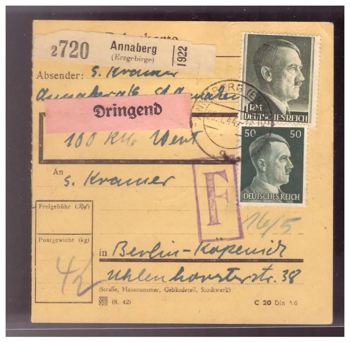 Dt- Reich (020986) Wertpaketkarte Hitlerfrankatur Annaberg vom 26.1.1944