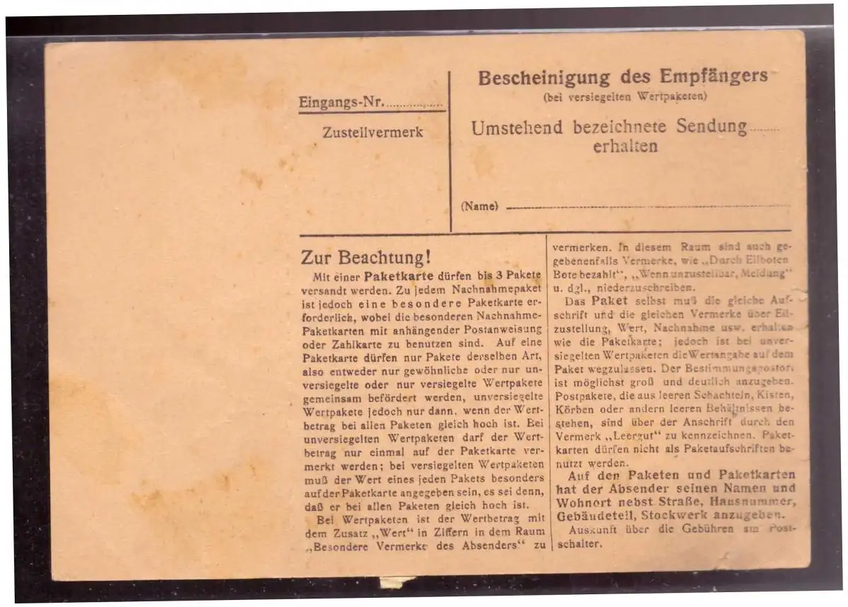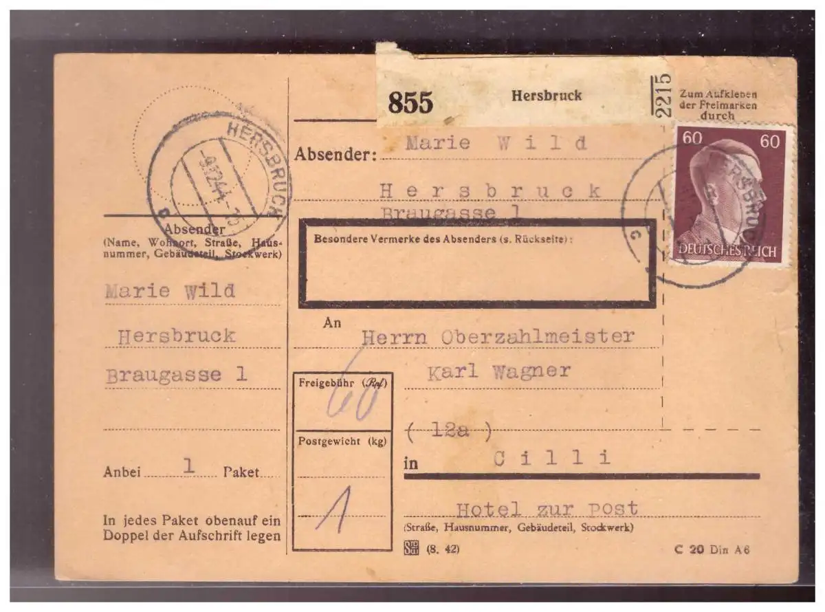 Dt- Reich (020992) Paketkarte Hitlerfrankatur Hersbruck vom 9.12.1944