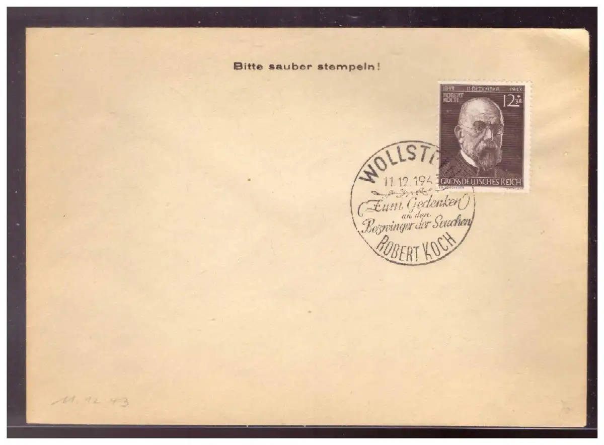 Dt- Reich (021344) Propaganda Beleg mit MNR 864 blanco mit SST Wollstein, Robert Koch gest.11.12.1943 wie im Michel