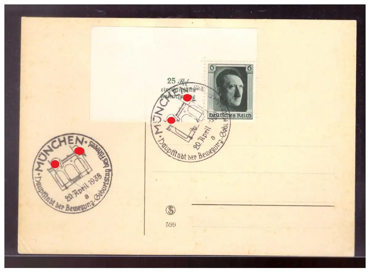 Dt- Reich (021373) Postkarte mit MNR 648, Blockmarke mit SR und SST München Geburtstag des Führers am 20.4.1938