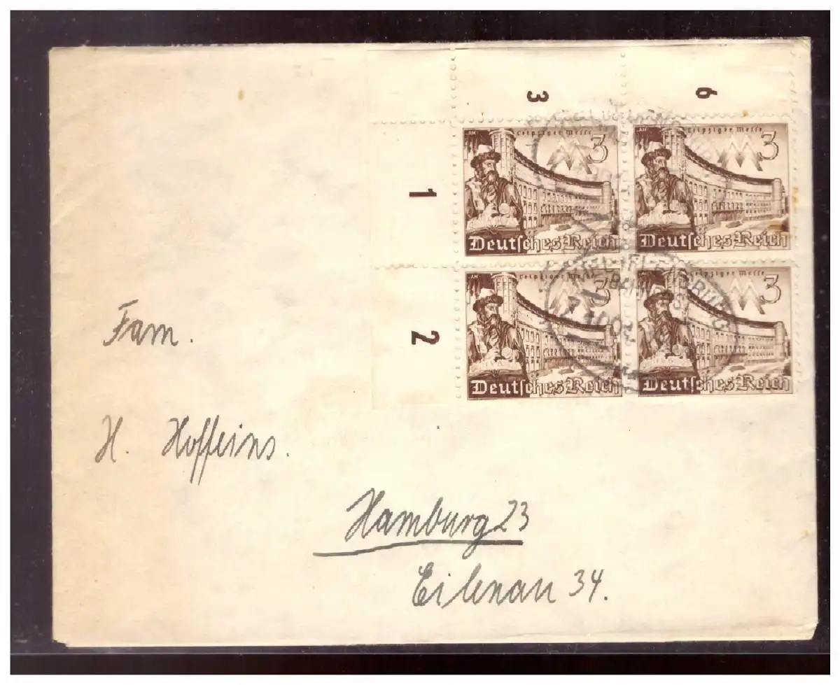 Dt- Reich (021404) Brief Eckrand Viererblock MNR 739, gelaufen mit Bahnpoststempel Kiel- Flensburg