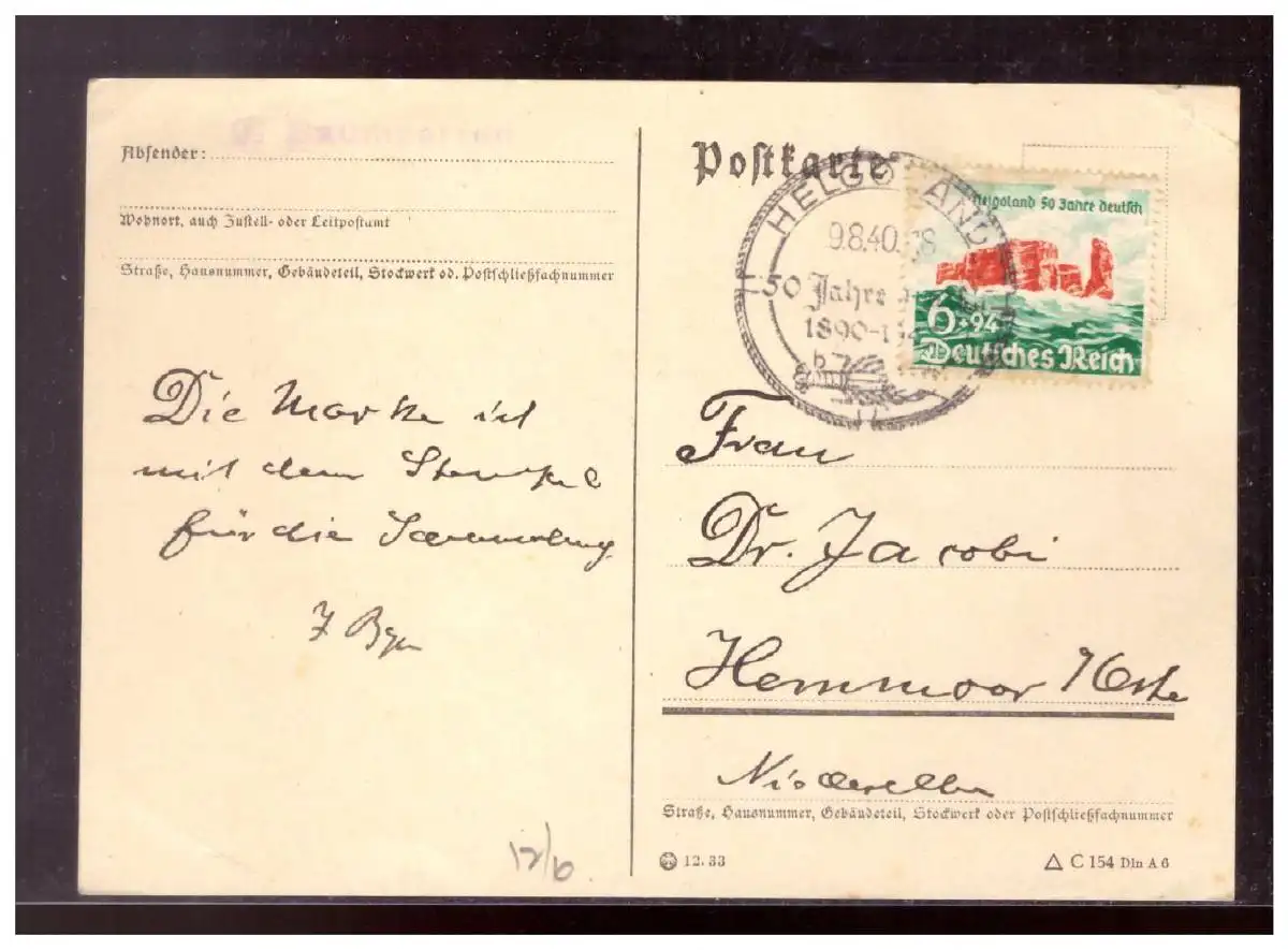 Dt- Reich (021412) Postkarte mit MNR 750 Helgoland gelaufen Helgoland mit ESST vom 9.8.1940, Marke 2. Wahl