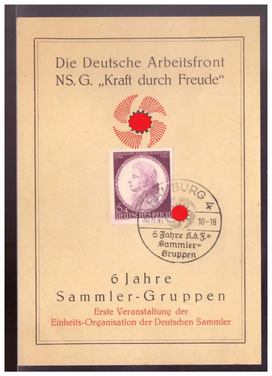DT- Reich (021477) Propaganda Gedenkblatt KDF Kraft durch Freude, 6 Jahre Sammler Gruppen mit SST Hamburg 30.11.1941