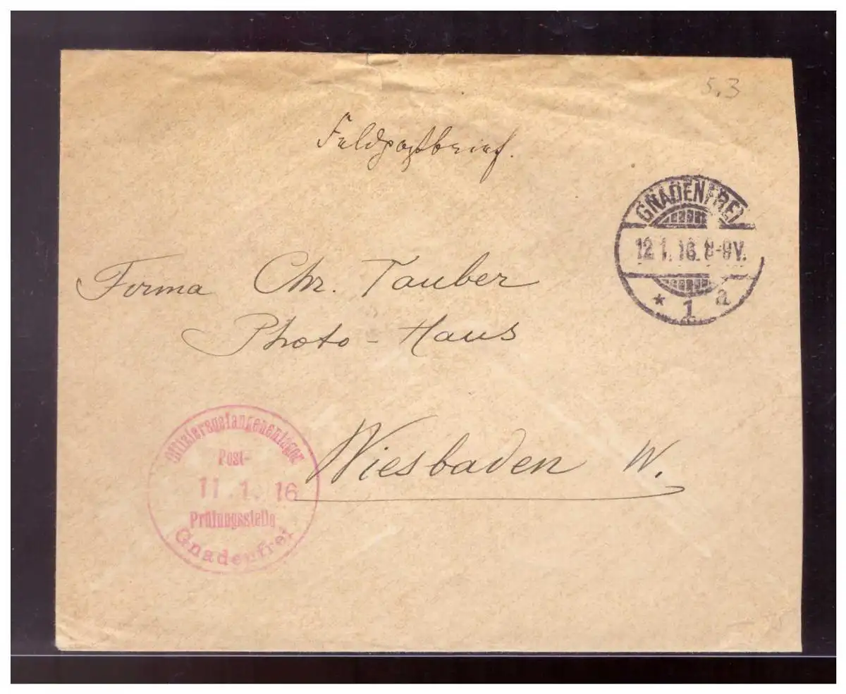 DT-Reich (021659) Propaganda Offiziers-Gefangenen- Lager Gnadenfrei, vorgedruckter Umschlag, mit Zensur, gelaufen