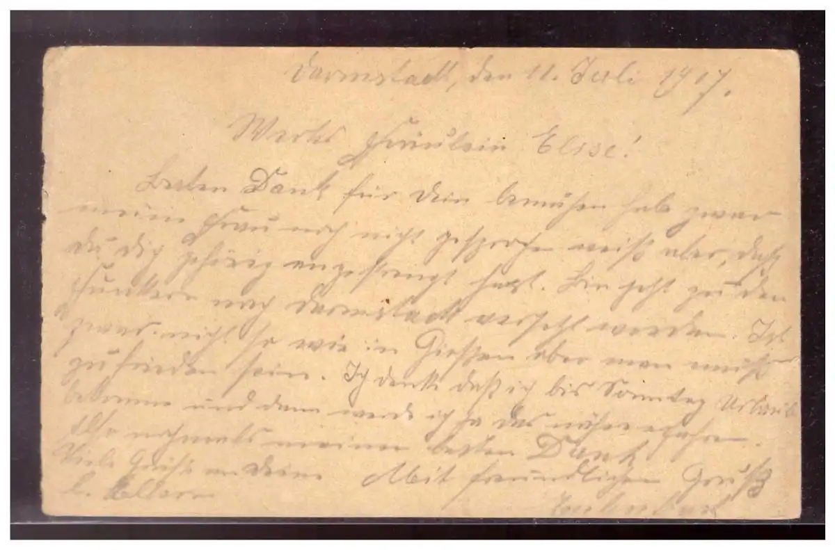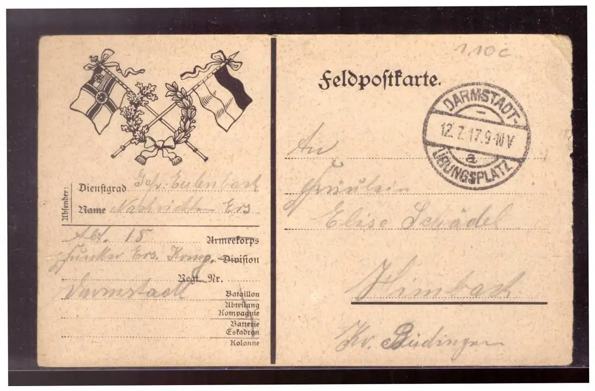DT-Reich (021764) Propagandakarte Feldpost, WKI mit Bild Zudruck, gekreuzte Fahnen, gel Darmstadt Übungsplatz 12.7.1917
