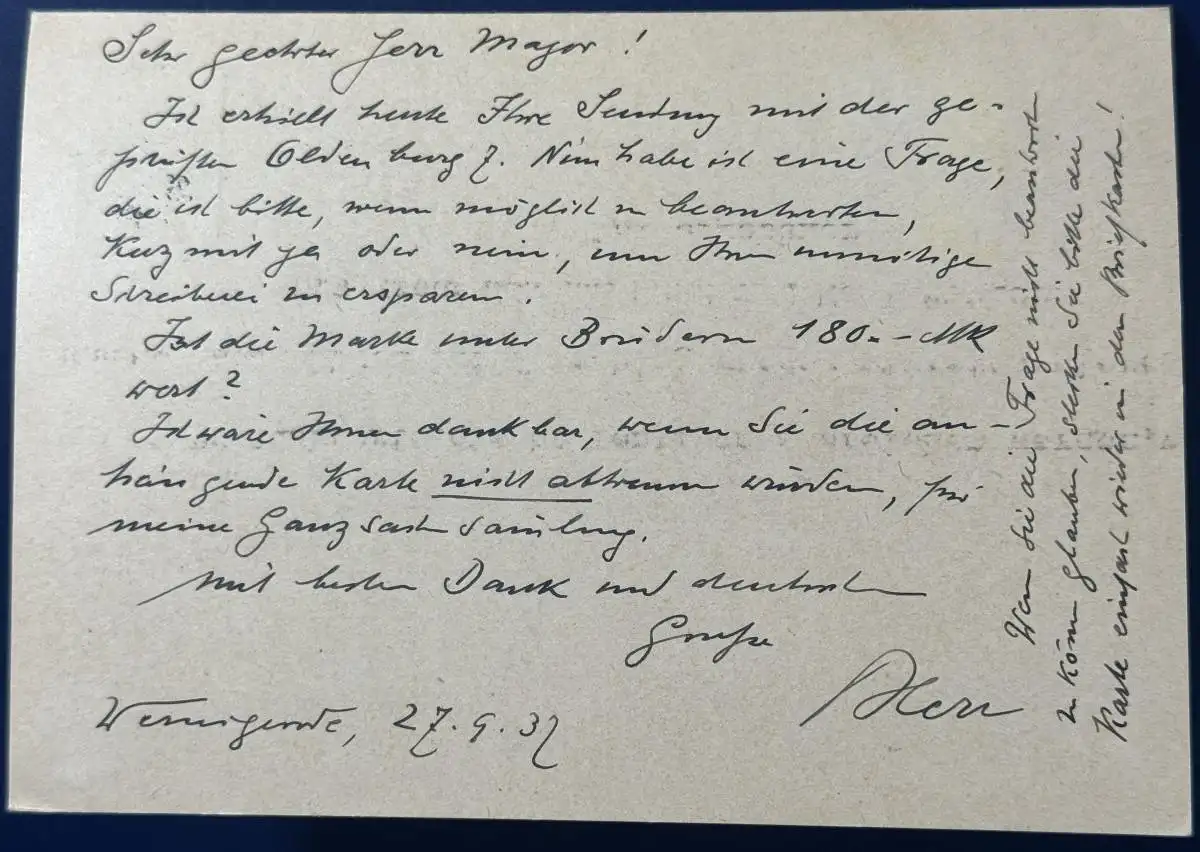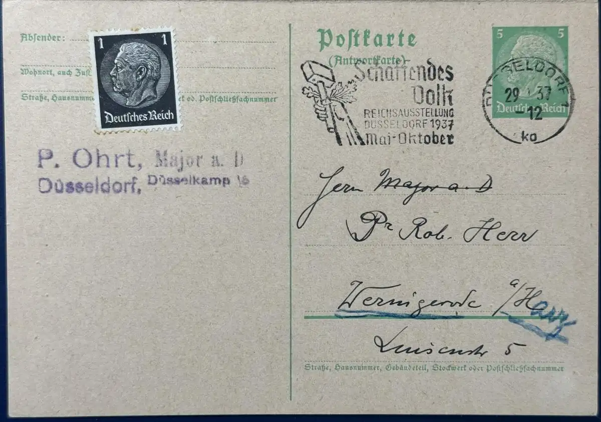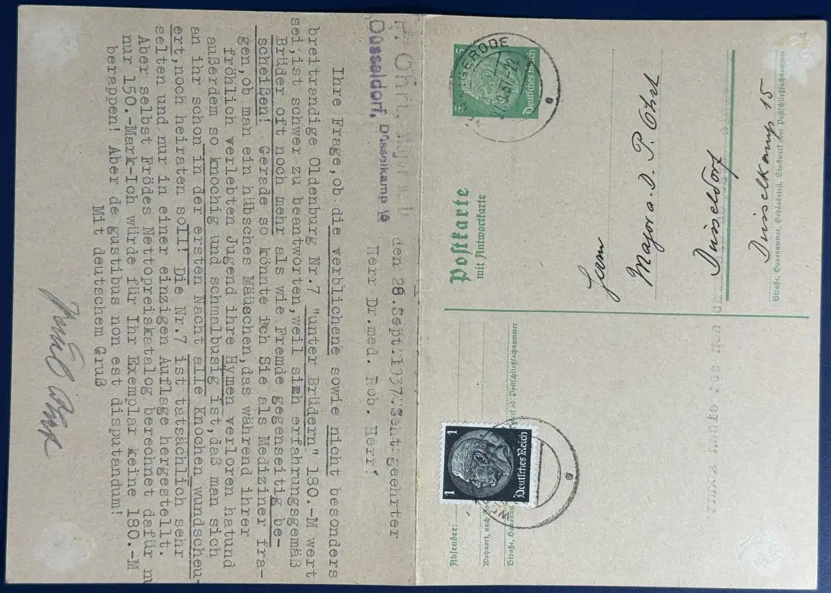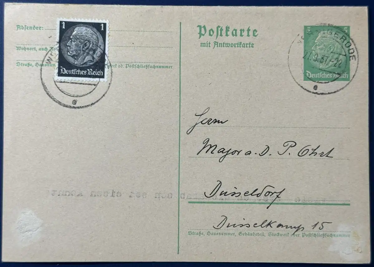 Postkarte m. Antwortkarte, Ganzsache, Deutsches (III.) Reich, Mi.Nr. P228 I mit Zusatzfrankatur, gelaufen mit Poststempel vom 27.09.1937 von Wernigerode nach Düsseldorf und zurück. Die Karte wurde auf Bitte des Absenders komplett zurückgeschickt, sehr kurzweilige Korrespondenz!