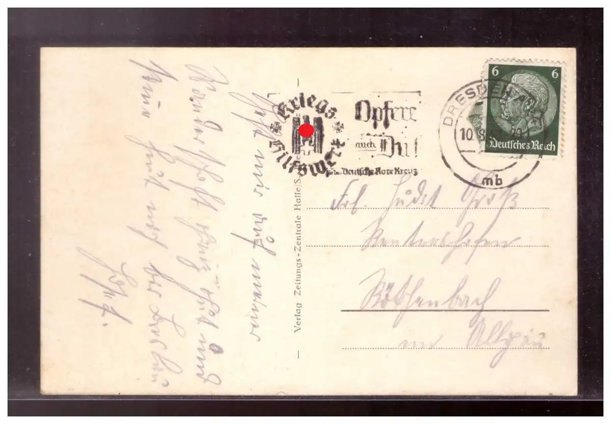 Dt- Reich (022273) Postkarte Halle mit Postwerbestempel Kriegshilfswerk Opfer auch Du!, gel. Dresden