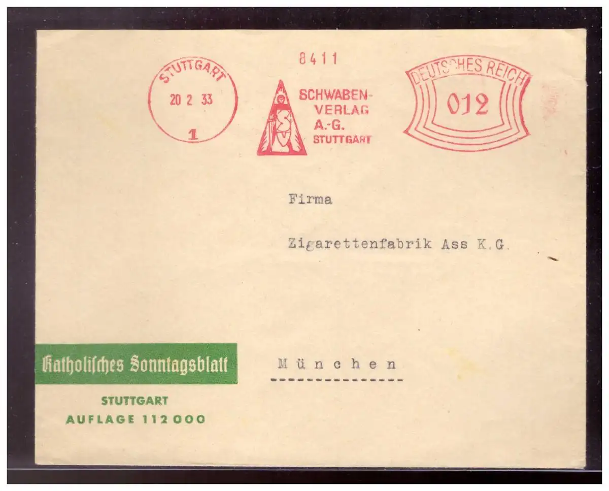 Dt- Reich (022352) Vorgedruckterbrief mit Freistempeler mit Werbung, Katholisches Sonntagsblatt, gelaufen 20.2.1933
