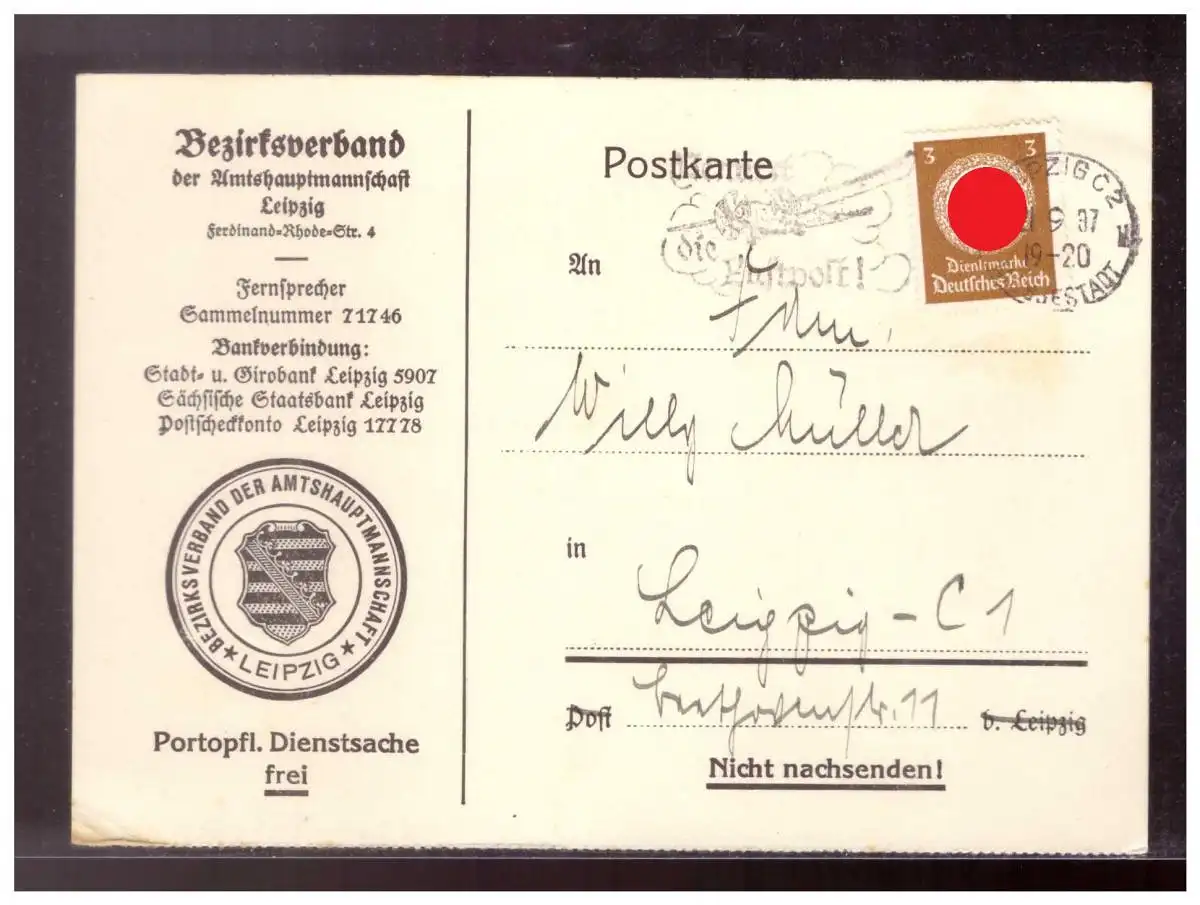 Dt- Reich (022364) Postkarte mit Vordruck Bezirksverband der Amtshauptmannschaft Leipzig, gel. Leipzig 21.9.1937