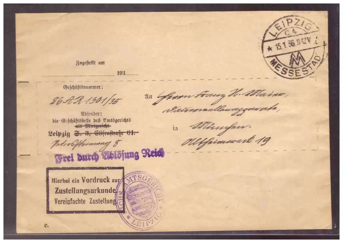 Dt- Reich (022375) Vorgedrukter Amtsgericht Brief gelaufen Frei Durch Ablösung Reich, gel. Leipzig 15.1.1936