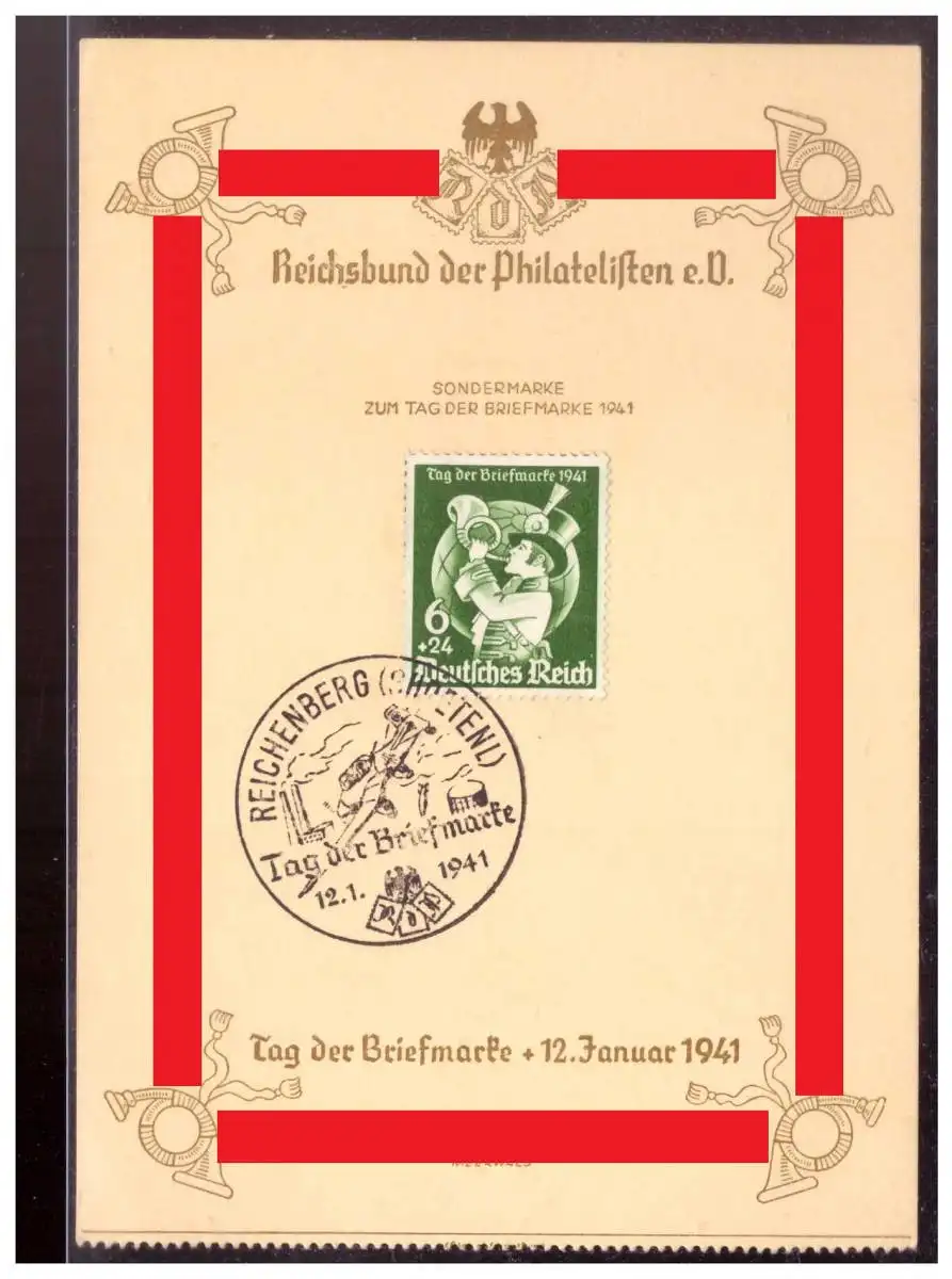 Sudetenland (022420) Propaganda Gedenkblatt Tag der Briefmarke 12.1.1941, gest Reichenberg mit SST
