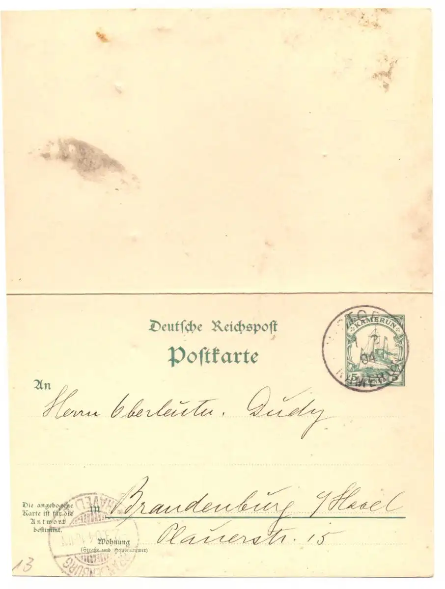 Kolonien (022590) Kamerum Doppelkarte Ganzsache P13 Stempel Viktora Mängel gelaufen 1.2.1904
