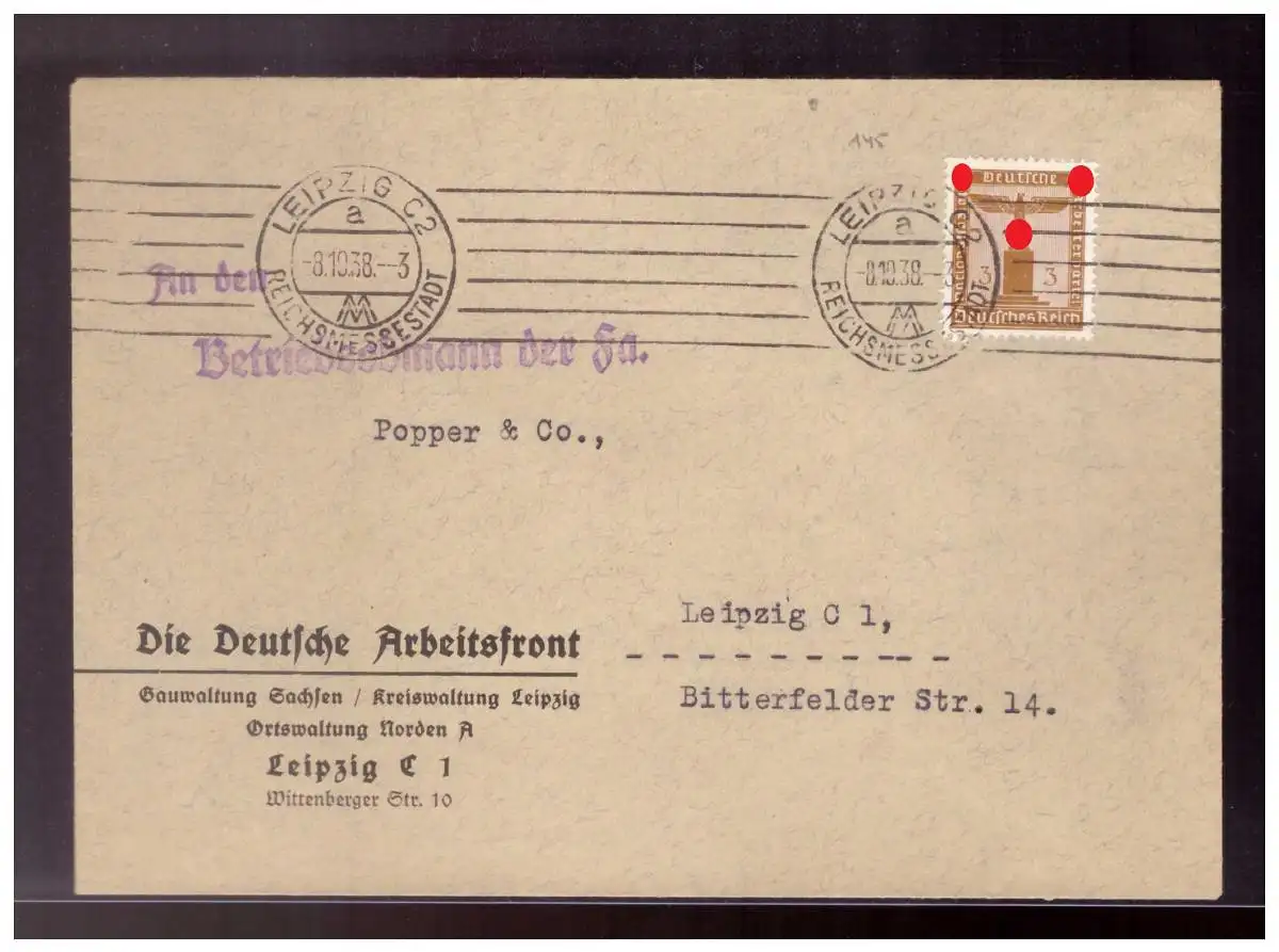 Dt- Reich (022611) Vorgeduckter Briefumschlag Die Deutsche Arbeitsfront Sachsen, gelaufen Leipzig am 8.10.1938 an Betriebsobmann d