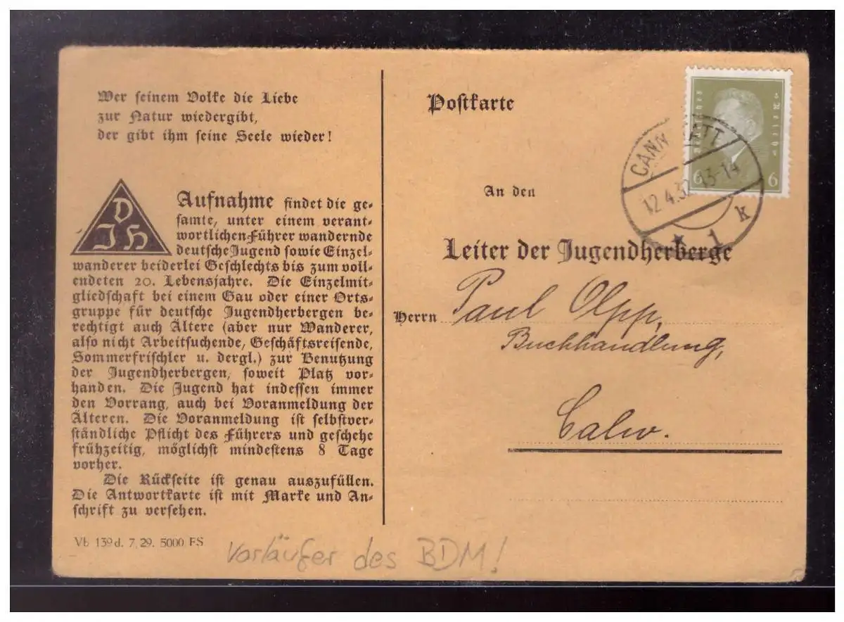 Dt- Reich (022842) Propaganda Postkarte DJH 4 Übernachtungen Jugmädchen Verein Cannstatt (vorläufer BDM) vom 12.4.1932