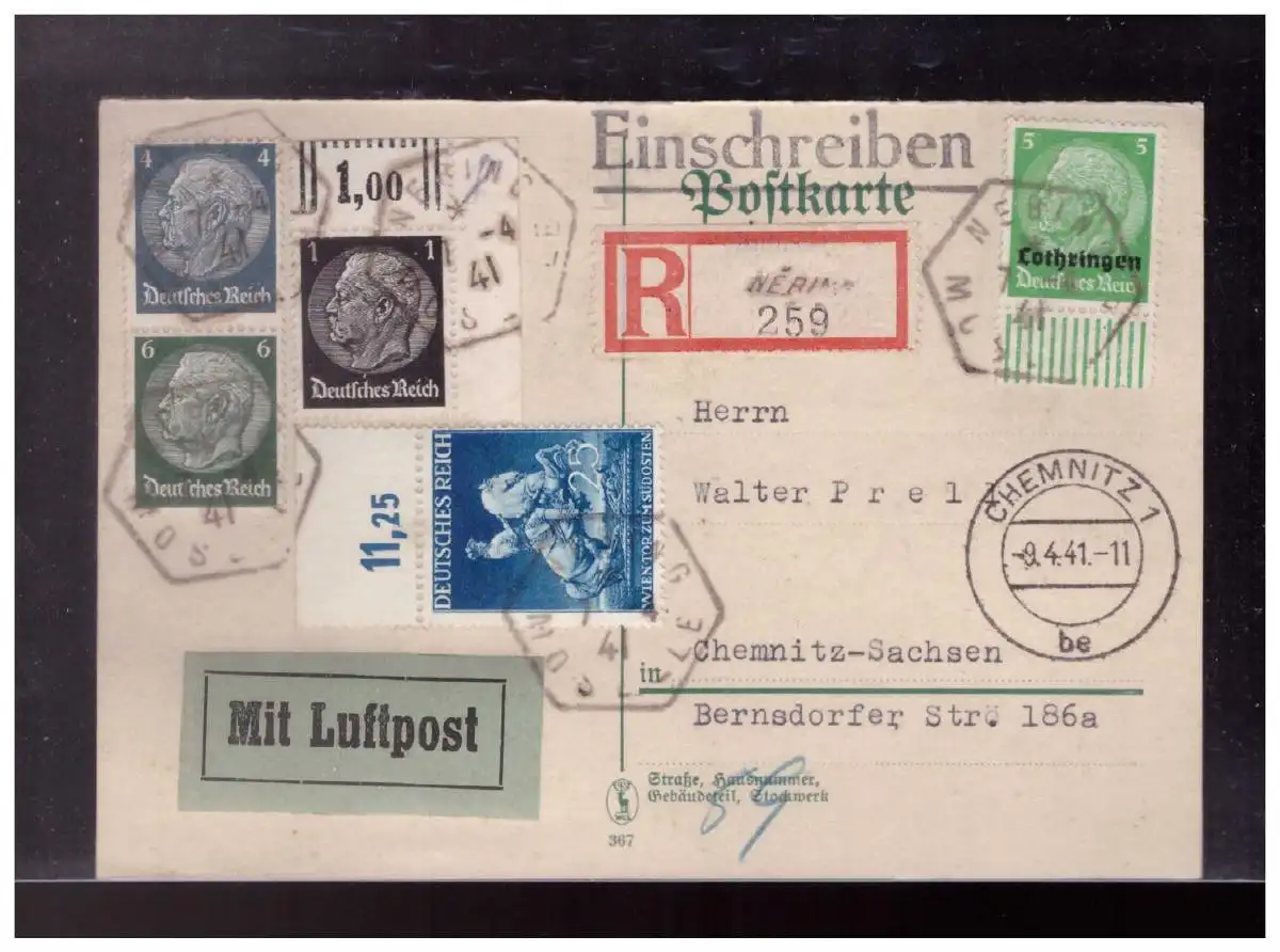 WK II Lothringen (022906) R- Lupo Karte mit Mif und Sonder R- Zettel Nebin gelaufen mit Alt- Französischen Stempel