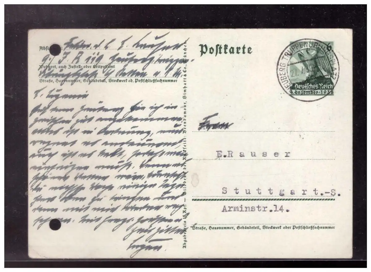 Dt- Reich (023023) Propaganda Ganzsache P275 gelaufen Aktengelocht Heuberg Truppenübungsplatz 27.7.1937