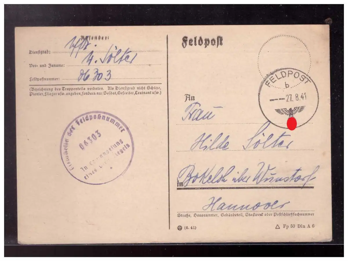 Dt- Reich (023024) Postkarte gel. mit Feldpost mit Ersatzbriefstempel in Ermangelung eines Dienstsiegels vom 27.8.1941